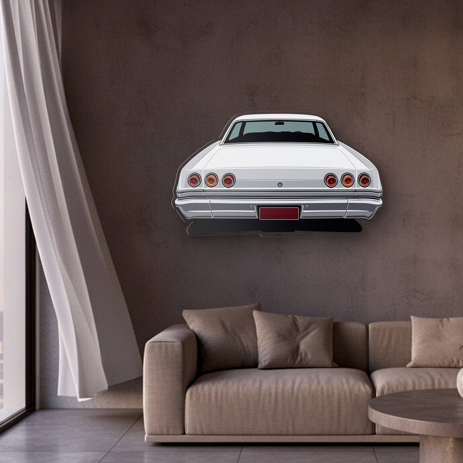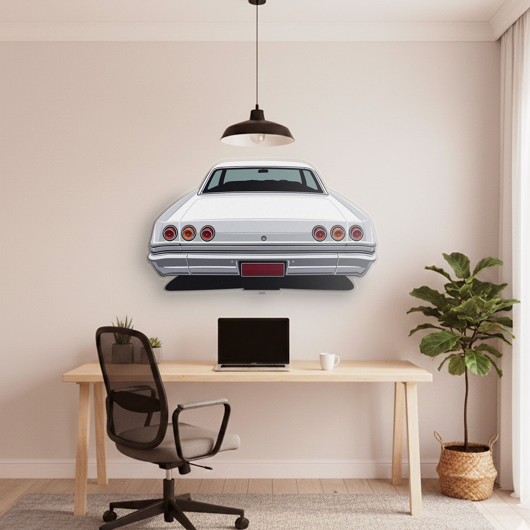 Dieser auffällige Impala 1965 Rück Acrylglasdruck verleiht Ihrem Raum, Büro oder Ihrer Garage einen Hauch von Lebendigkeit und Eleganz und zieht garantiert die Aufmerksamkeit jedes Rennsport- oder Auto-Enthusiasten auf sich.