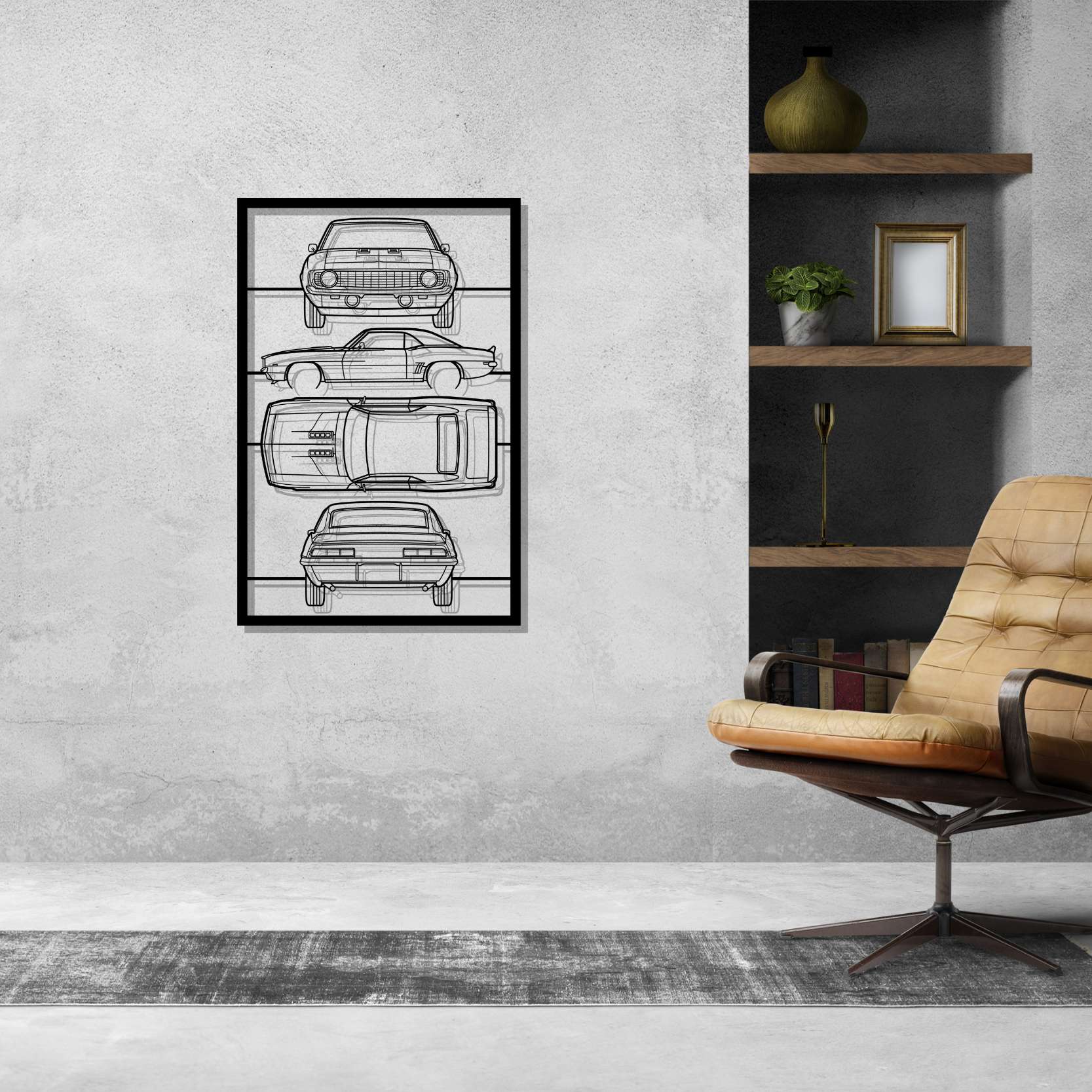 Diese Camaro SS 1969 Wandkunst aus Metall mit Rahmen-Silhouette verleiht Ihrem Büro, Zimmer oder Ihrer Garage einen einzigartigen Look, der die Aufmerksamkeit aller Rennsport- und Autoliebhaber auf sich zieht und Ihrem Wohndesign eine subtile Note verleiht.