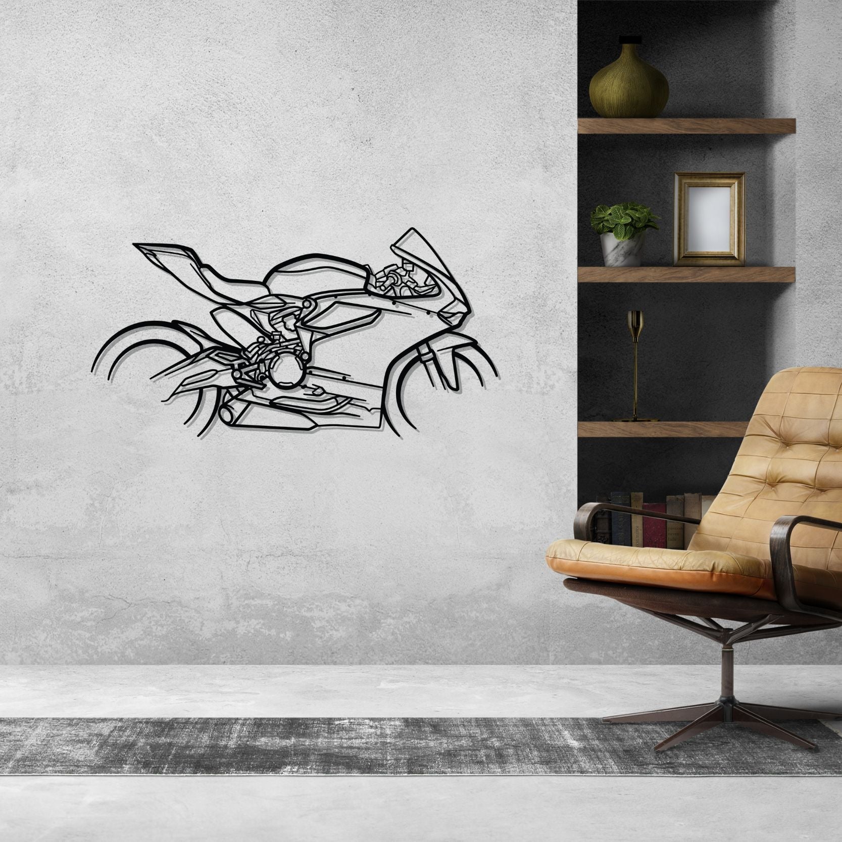Diese 959 Panigale Corse Silhouette-Wandkunst aus Metall verleiht Ihrem Büro, Zimmer oder Ihrer Garage einen einzigartigen Look, der die Aufmerksamkeit aller Rennsport- und Autoliebhaber auf sich zieht und Ihrem Wohndesign eine subtile Note verleiht.