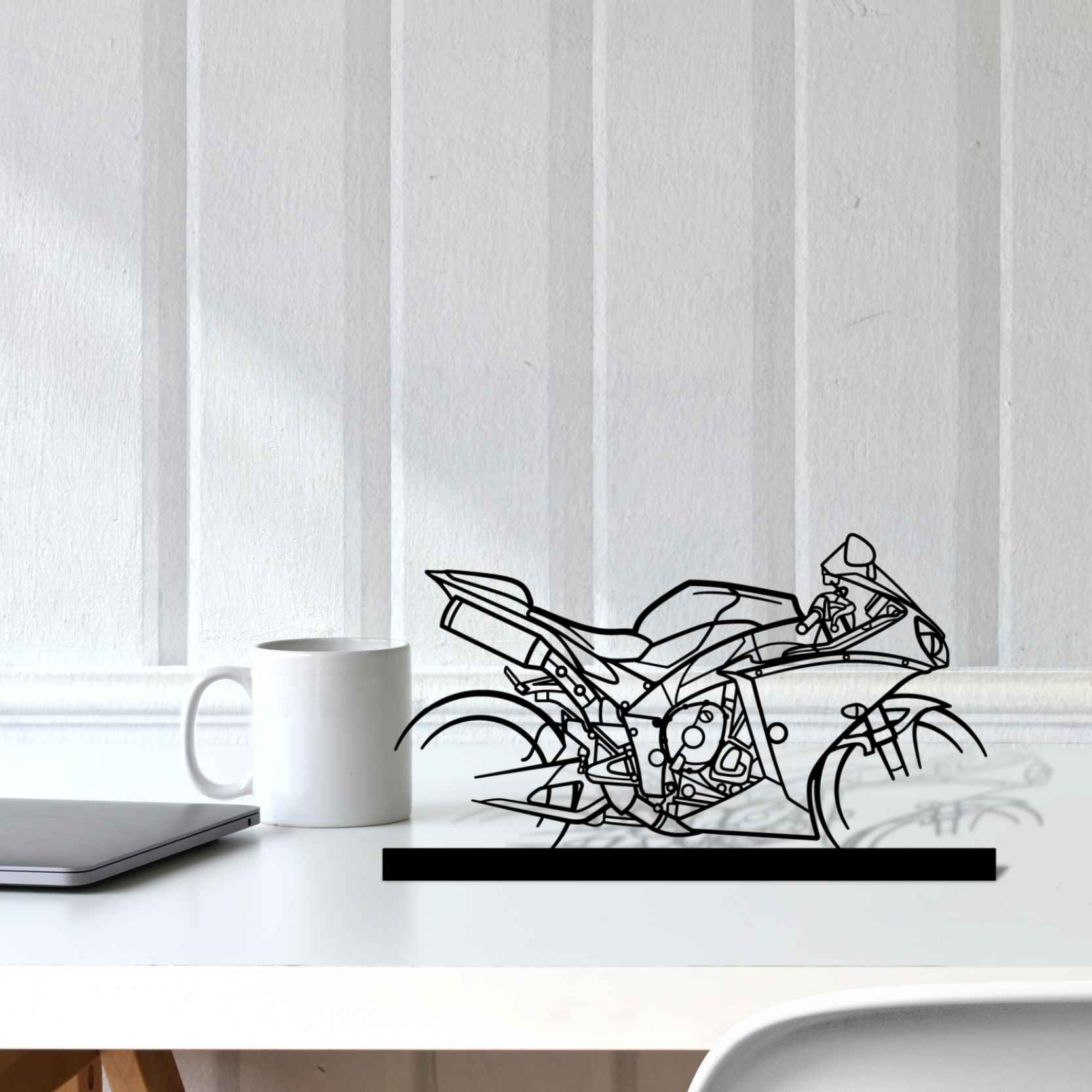 Diese R1 2015 Silhouette-Kunstständer aus Metall verleiht Ihrem Schreibtisch, Wohnzimmer oder Ihrer Garagenablage einen einzigartigen Look, der die Aufmerksamkeit aller Rennsport- und Autoliebhaber auf sich zieht und Ihrem Wohndesign eine subtile Note verleiht.