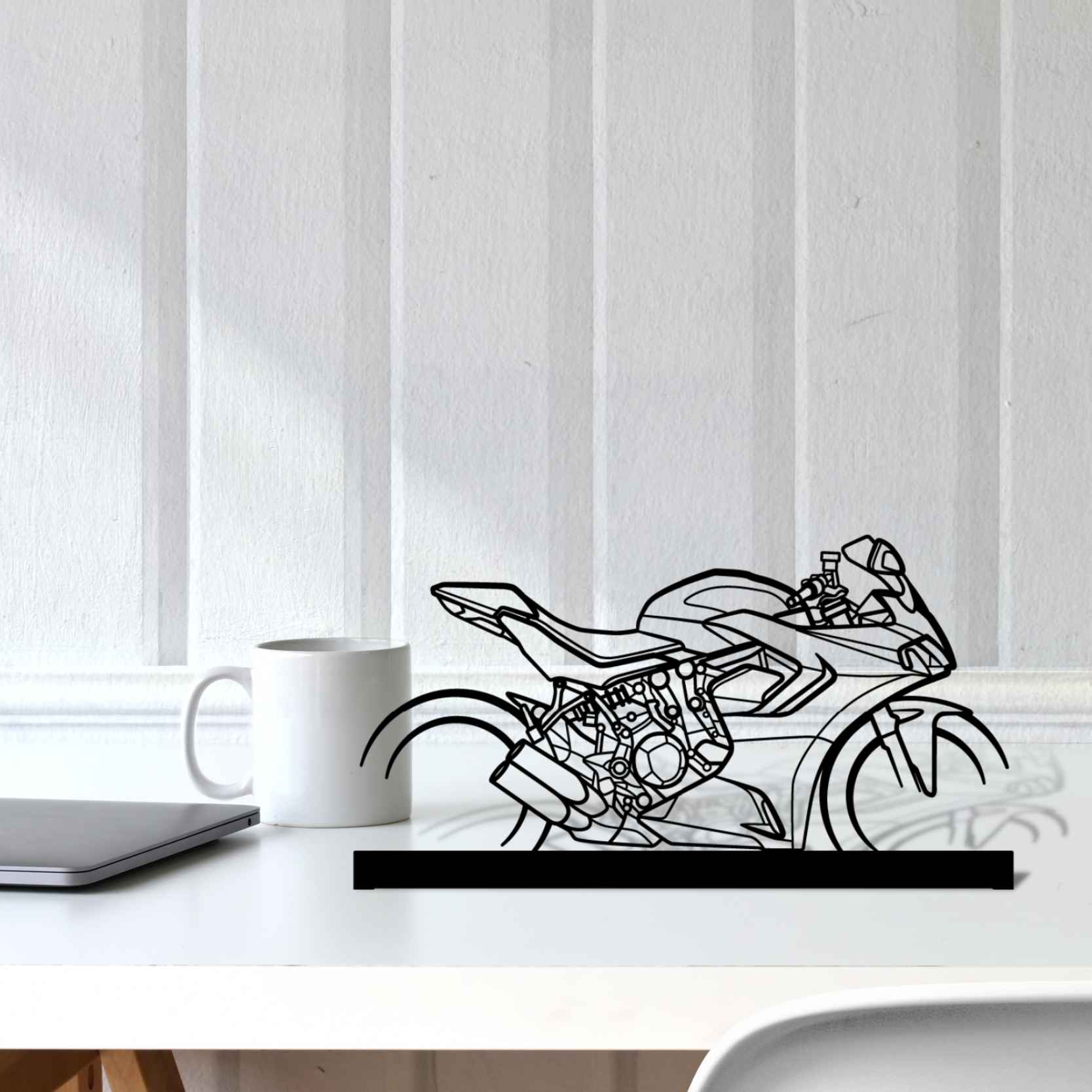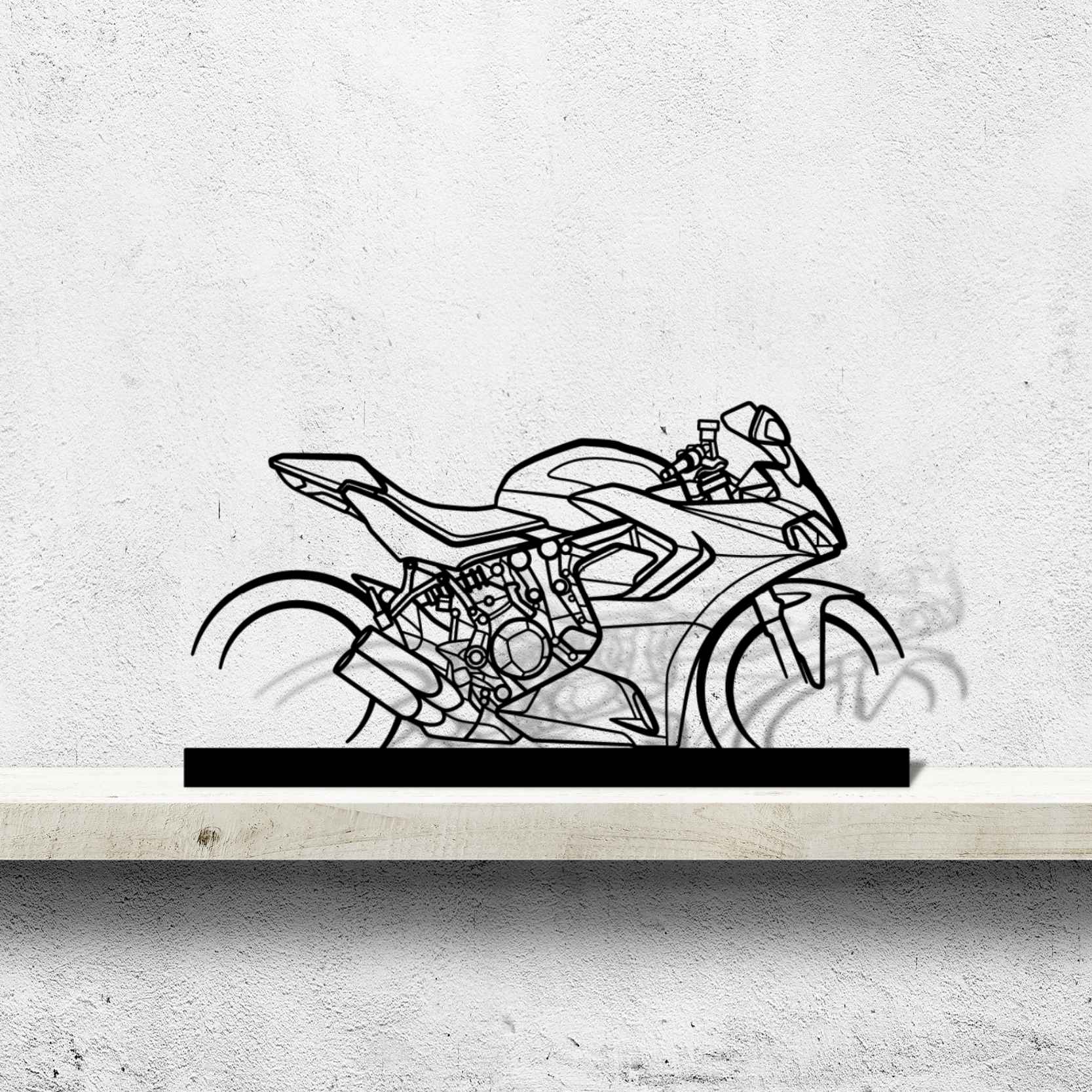 Diese SuperSport 950S 2022 Silhouette-Kunstständer aus Metall verleiht Ihrem Schreibtisch, Wohnzimmer oder Ihrer Garagenablage einen einzigartigen Look, der die Aufmerksamkeit aller Rennsport- und Autoliebhaber auf sich zieht und Ihrem Wohndesign eine subtile Note verleiht.