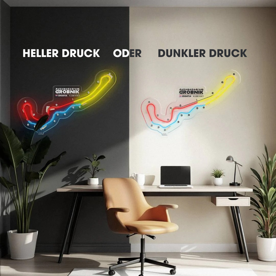 Dieses Automotodrom Grobnik Neon-Rennstrecke bringt jeden Raum zum Leuchten. Jede Rennstrecke ist in drei typischen Farben der Formel 1 gehalten und zeigt den Namen der Rennstrecke sowie die Länge und das Land, in dem sie sich befindet. Es ist eine perfekte Möglichkeit, etwas Farbe ins Spiel zu bringen, das Gesamtbild aufzuwerten und die Aufmerksamkeit aller auf sich zu ziehen, egal, ob Rennsportfan oder nicht.