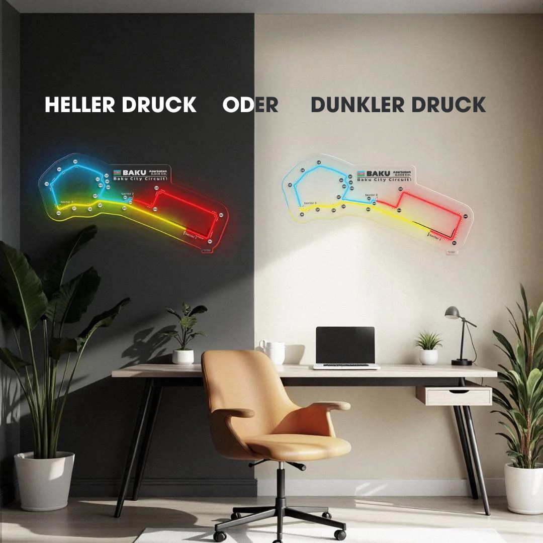 Dieses Baku City Circuit Neon-Rennstrecke bringt jeden Raum zum Leuchten. Jede Rennstrecke ist in drei typischen Farben der Formel 1 gehalten und zeigt den Namen der Rennstrecke sowie die Länge und das Land, in dem sie sich befindet. Es ist eine perfekte Möglichkeit, etwas Farbe ins Spiel zu bringen, das Gesamtbild aufzuwerten und die Aufmerksamkeit aller auf sich zu ziehen, egal, ob Rennsportfan oder nicht.