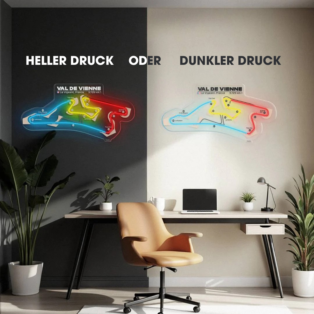 Dieses Circuit du Val de Vienne Neon-Rennstrecke bringt jeden Raum zum Leuchten. Jede Rennstrecke ist in drei typischen Farben der Formel 1 gehalten und zeigt den Namen der Rennstrecke sowie die Länge und das Land, in dem sie sich befindet. Es ist eine perfekte Möglichkeit, etwas Farbe ins Spiel zu bringen, das Gesamtbild aufzuwerten und die Aufmerksamkeit aller auf sich zu ziehen, egal, ob Rennsportfan oder nicht.