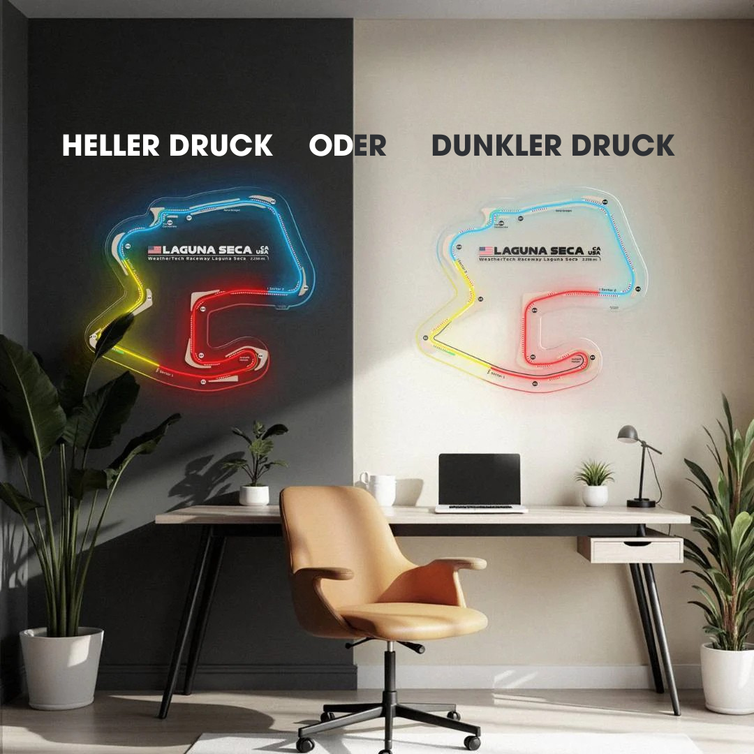 Dieses Laguna Seca Raceway Neon-Rennstrecke bringt jeden Raum zum Leuchten. Jede Rennstrecke ist in drei typischen Farben der Formel 1 gehalten und zeigt den Namen der Rennstrecke sowie die Länge und das Land, in dem sie sich befindet. Es ist eine perfekte Möglichkeit, etwas Farbe ins Spiel zu bringen, das Gesamtbild aufzuwerten und die Aufmerksamkeit aller auf sich zu ziehen, egal, ob Rennsportfan oder nicht.