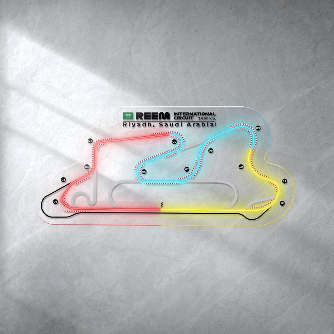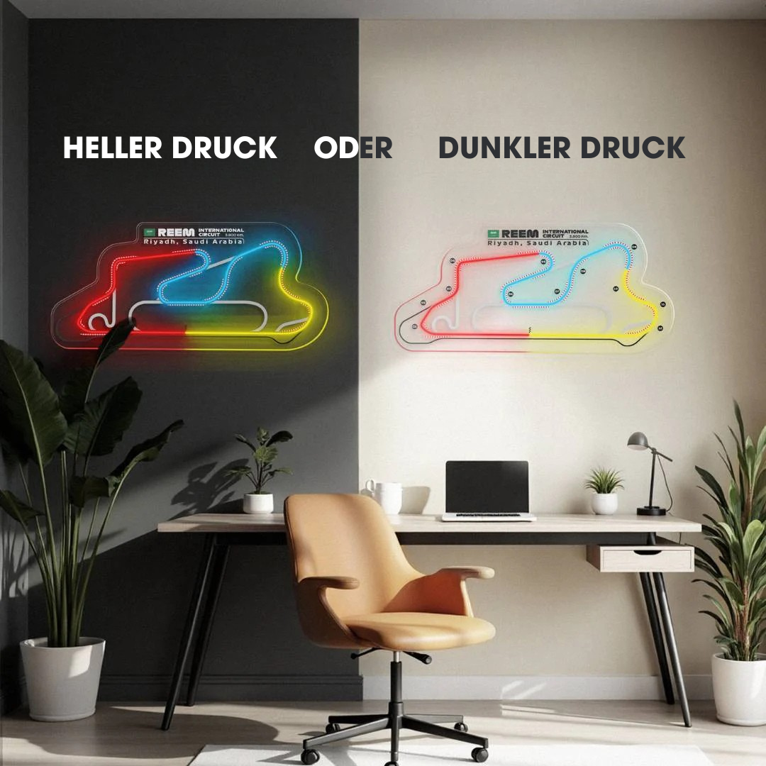 Dieses Reem International Circuit Neon-Rennstrecke bringt jeden Raum zum Leuchten. Jede Rennstrecke ist in drei typischen Farben der Formel 1 gehalten und zeigt den Namen der Rennstrecke sowie die Länge und das Land, in dem sie sich befindet. Es ist eine perfekte Möglichkeit, etwas Farbe ins Spiel zu bringen, das Gesamtbild aufzuwerten und die Aufmerksamkeit aller auf sich zu ziehen, egal, ob Rennsportfan oder nicht.