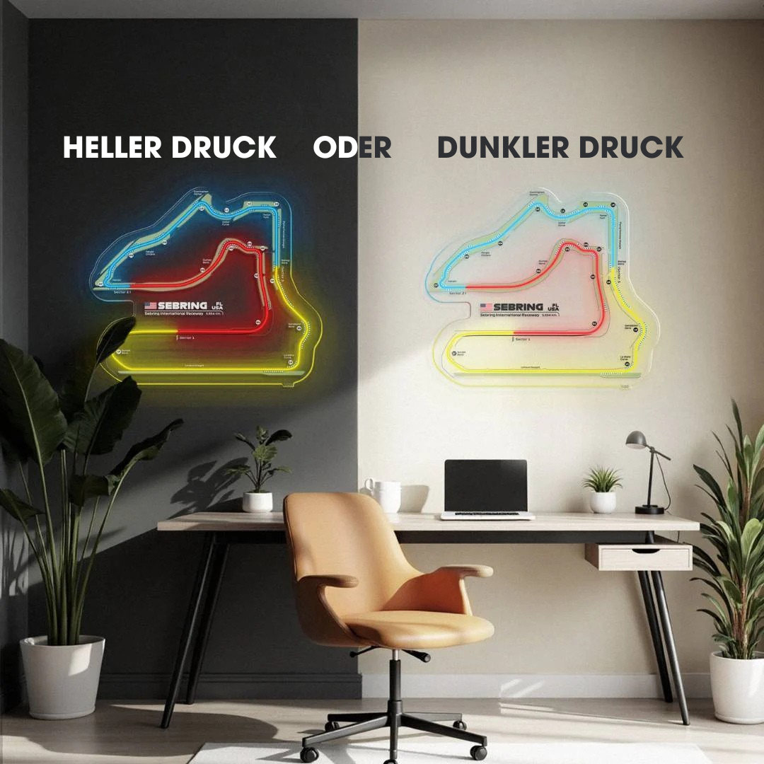 Dieses Sebring International Raceway Neon-Rennstrecke bringt jeden Raum zum Leuchten. Jede Rennstrecke ist in drei typischen Farben der Formel 1 gehalten und zeigt den Namen der Rennstrecke sowie die Länge und das Land, in dem sie sich befindet. Es ist eine perfekte Möglichkeit, etwas Farbe ins Spiel zu bringen, das Gesamtbild aufzuwerten und die Aufmerksamkeit aller auf sich zu ziehen, egal, ob Rennsportfan oder nicht.