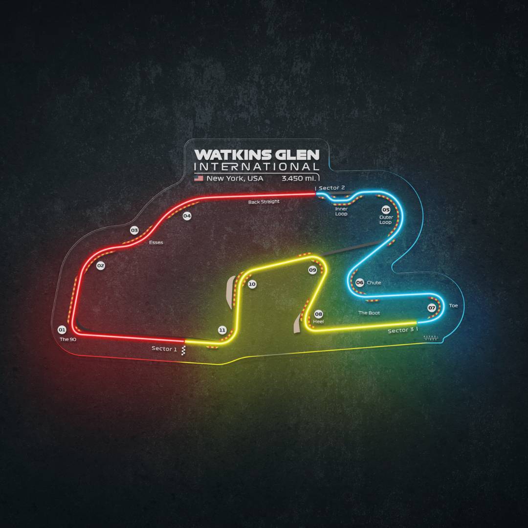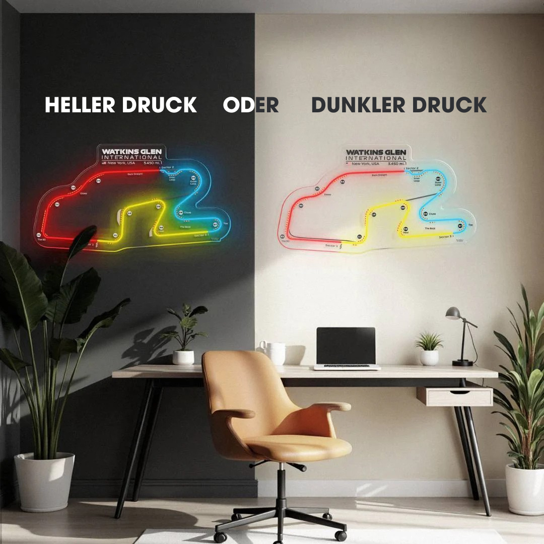 Dieses Watkins Glen International Neon-Rennstrecke bringt jeden Raum zum Leuchten. Jede Rennstrecke ist in drei typischen Farben der Formel 1 gehalten und zeigt den Namen der Rennstrecke sowie die Länge und das Land, in dem sie sich befindet. Es ist eine perfekte Möglichkeit, etwas Farbe ins Spiel zu bringen, das Gesamtbild aufzuwerten und die Aufmerksamkeit aller auf sich zu ziehen, egal, ob Rennsportfan oder nicht.