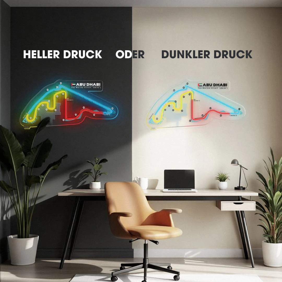 Dieses Yas Marina Circuit Neon-Rennstrecke bringt jeden Raum zum Leuchten. Jede Rennstrecke ist in drei typischen Farben der Formel 1 gehalten und zeigt den Namen der Rennstrecke sowie die Länge und das Land, in dem sie sich befindet. Es ist eine perfekte Möglichkeit, etwas Farbe ins Spiel zu bringen, das Gesamtbild aufzuwerten und die Aufmerksamkeit aller auf sich zu ziehen, egal, ob Rennsportfan oder nicht.