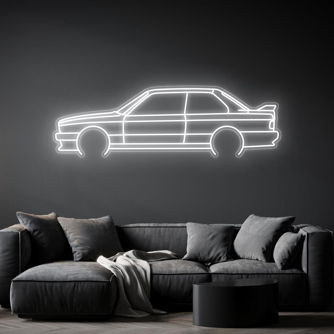 Diese auffällige E30 M3 Detailed Neon-Silhouette Ihrem Zimmer, Büro oder Ihrer Garage einen wunderschönen Lichtakzent und moderne Eleganz und wird die Aufmerksamkeit jedes Rennsport- oder Autoliebhabers auf sich ziehen.