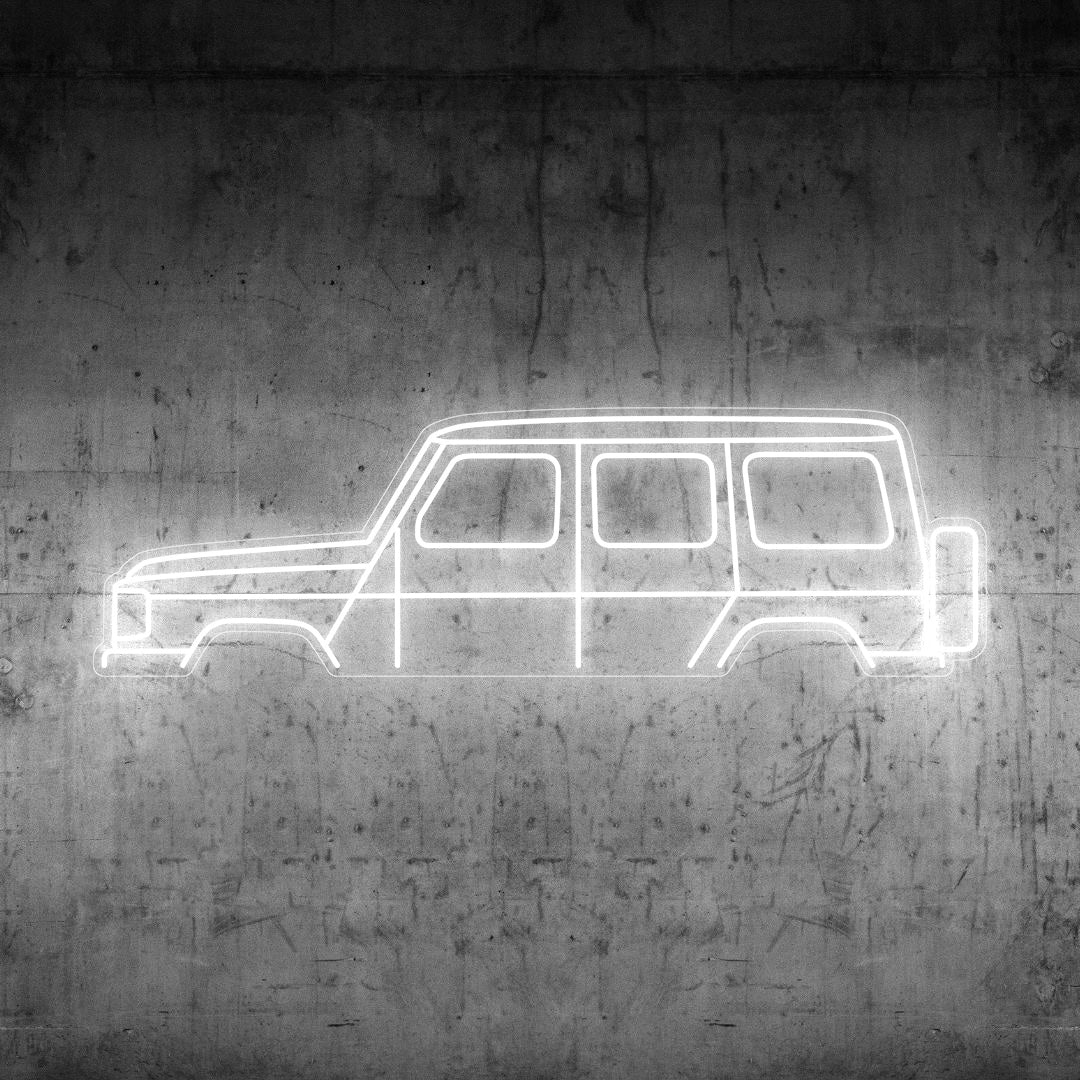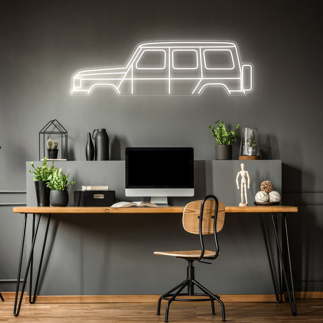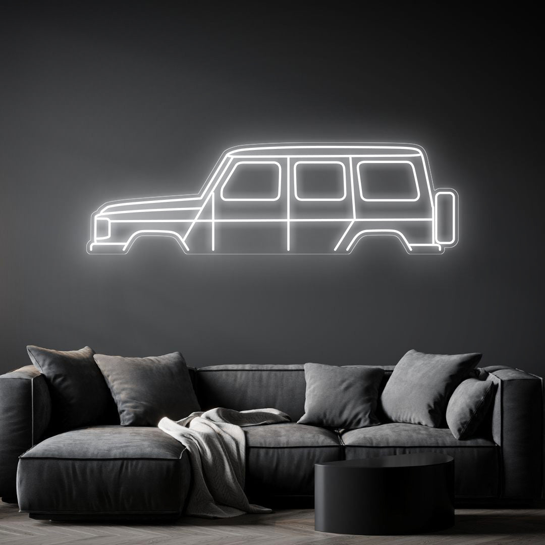 Diese auffällige G Class Neon-Silhouette Ihrem Zimmer, Büro oder Ihrer Garage einen wunderschönen Lichtakzent und moderne Eleganz und wird die Aufmerksamkeit jedes Rennsport- oder Autoliebhabers auf sich ziehen.