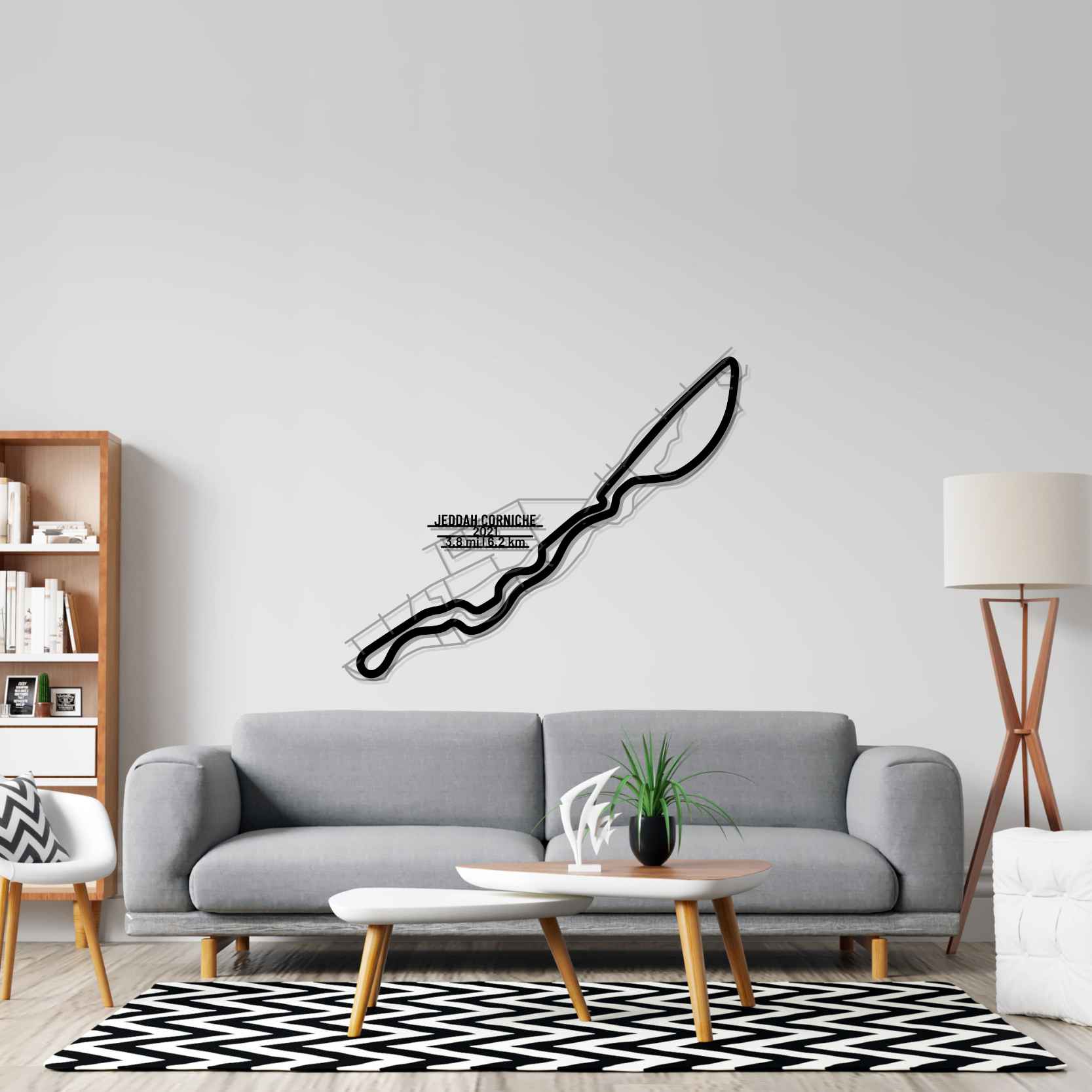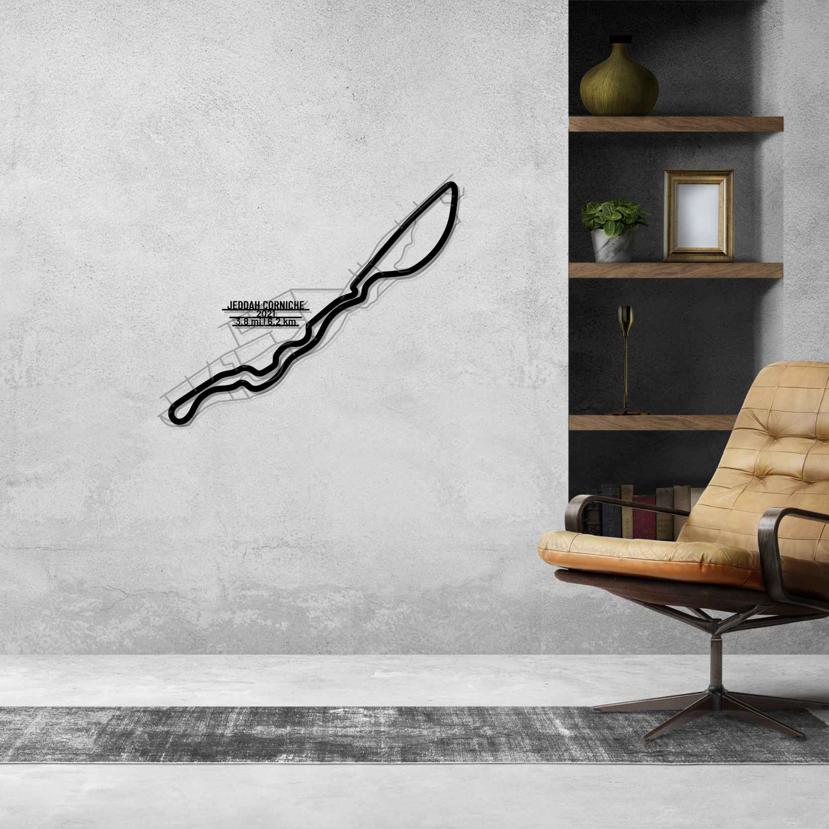 <Dieses Jeddah Corniche Wandkunst aus Metall, ist unser erstes mehrschichtiges und mehrfarbiges 3-teiliges Wandkunstwerk. Es umfasst die Schiene in unserem klassischen schwarzen Finish und den umgebenden Bereich in einem glänzenden und funkelnden Grauton. Als Krönung bringen wir eine Metallplatte mit dem Namen der Strecke, ihrer Länge und dem Datum ihrer Fertigstellung an. Dieses Meisterwerk allein oder in Kombination mit einem unserer anderen Produkte verleiht Ihrem Büro, Zimmer oder Ihrer Garage einen einzigartigen Look, der die Aufmerksamkeit jedes Rennsport- oder Autoliebhabers auf sich zieht und Ihrer Inneneinrichtung einen subtilen Hauch von Motorsport-Flair verleiht.