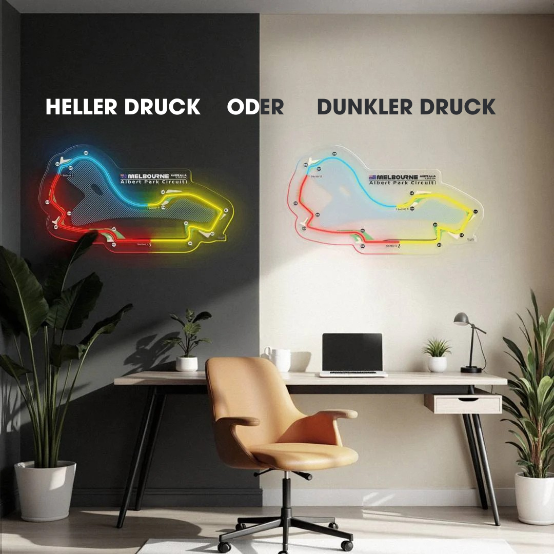 Dieses Albert Park Circuit Neon-Rennstrecke bringt jeden Raum zum Leuchten. Jede Rennstrecke ist in drei typischen Farben der Formel 1 gehalten und zeigt den Namen der Rennstrecke sowie die Länge und das Land, in dem sie sich befindet. Es ist eine perfekte Möglichkeit, etwas Farbe ins Spiel zu bringen, das Gesamtbild aufzuwerten und die Aufmerksamkeit aller auf sich zu ziehen, egal, ob Rennsportfan oder nicht.
