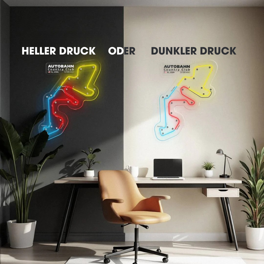 Dieses Autobahn Country Club Neon-Rennstrecke bringt jeden Raum zum Leuchten. Jede Rennstrecke ist in drei typischen Farben der Formel 1 gehalten und zeigt den Namen der Rennstrecke sowie die Länge und das Land, in dem sie sich befindet. Es ist eine perfekte Möglichkeit, etwas Farbe ins Spiel zu bringen, das Gesamtbild aufzuwerten und die Aufmerksamkeit aller auf sich zu ziehen, egal, ob Rennsportfan oder nicht.