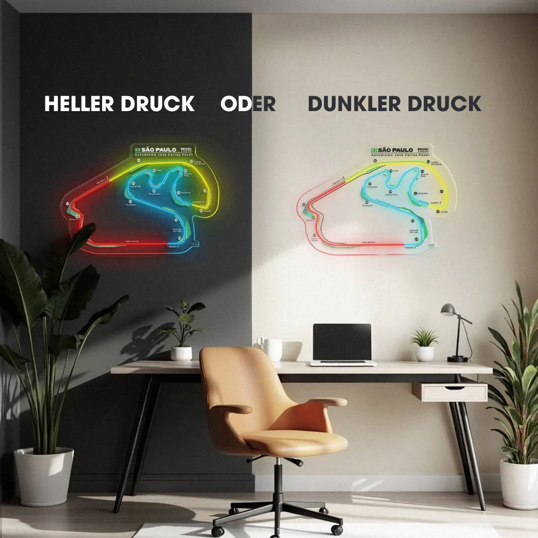 Dieses Autodromo Jose Carlos Pace Neon-Rennstrecke bringt jeden Raum zum Leuchten. Jede Rennstrecke ist in drei typischen Farben der Formel 1 gehalten und zeigt den Namen der Rennstrecke sowie die Länge und das Land, in dem sie sich befindet. Es ist eine perfekte Möglichkeit, etwas Farbe ins Spiel zu bringen, das Gesamtbild aufzuwerten und die Aufmerksamkeit aller auf sich zu ziehen, egal, ob Rennsportfan oder nicht.