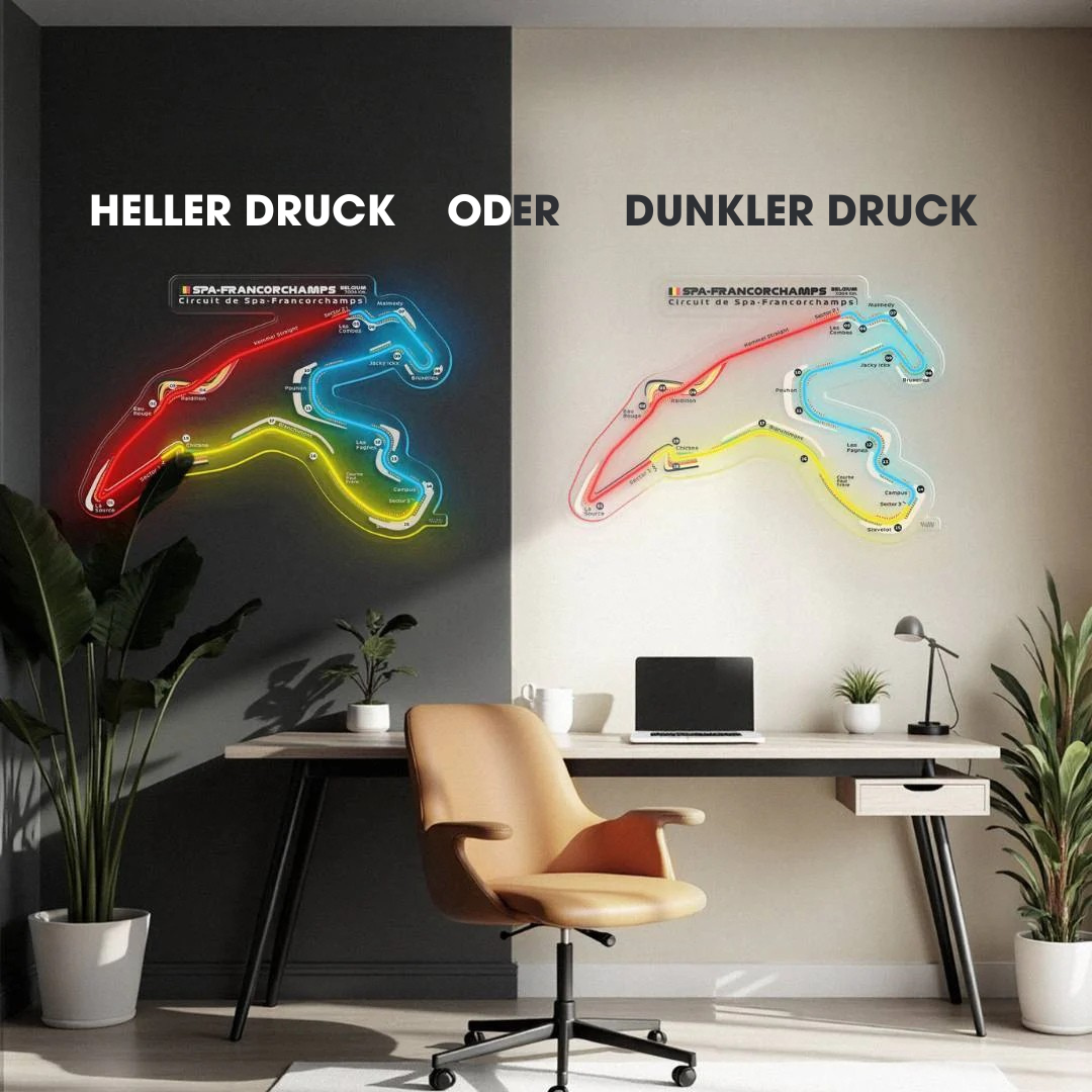 Dieses Circuit De Spa-Francorchamps Neon-Rennstrecke bringt jeden Raum zum Leuchten. Jede Rennstrecke ist in drei typischen Farben der Formel 1 gehalten und zeigt den Namen der Rennstrecke sowie die Länge und das Land, in dem sie sich befindet. Es ist eine perfekte Möglichkeit, etwas Farbe ins Spiel zu bringen, das Gesamtbild aufzuwerten und die Aufmerksamkeit aller auf sich zu ziehen, egal, ob Rennsportfan oder nicht.