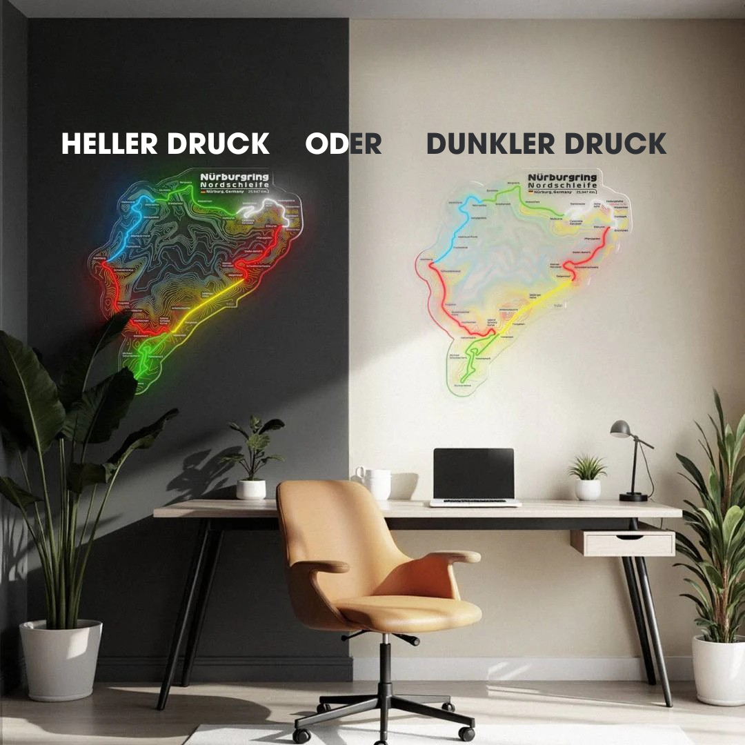 Dieses Nürburgring Nordschleife Neon-Rennstrecke bringt jeden Raum zum Leuchten. Jede Rennstrecke präsentiert 5 auffällige Farben, den Namen der Rennstrecke sowie die Distanz und das Land, in dem sie sich befindet. Es ist die perfekte Möglichkeit, Farbe ins Spiel zu bringen, das Gesamtbild zu verbessern und die Aufmerksamkeit von Rennsportbegeisterten – aber auch von anderen – auf sich zu ziehen.