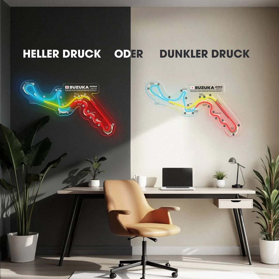 Dieses Suzuka International Racing Course Neon-Rennstrecke bringt jeden Raum zum Leuchten. Jede Rennstrecke ist in drei typischen Farben der Formel 1 gehalten und zeigt den Namen der Rennstrecke sowie die Länge und das Land, in dem sie sich befindet. Es ist eine perfekte Möglichkeit, etwas Farbe ins Spiel zu bringen, das Gesamtbild aufzuwerten und die Aufmerksamkeit aller auf sich zu ziehen, egal, ob Rennsportfan oder nicht.