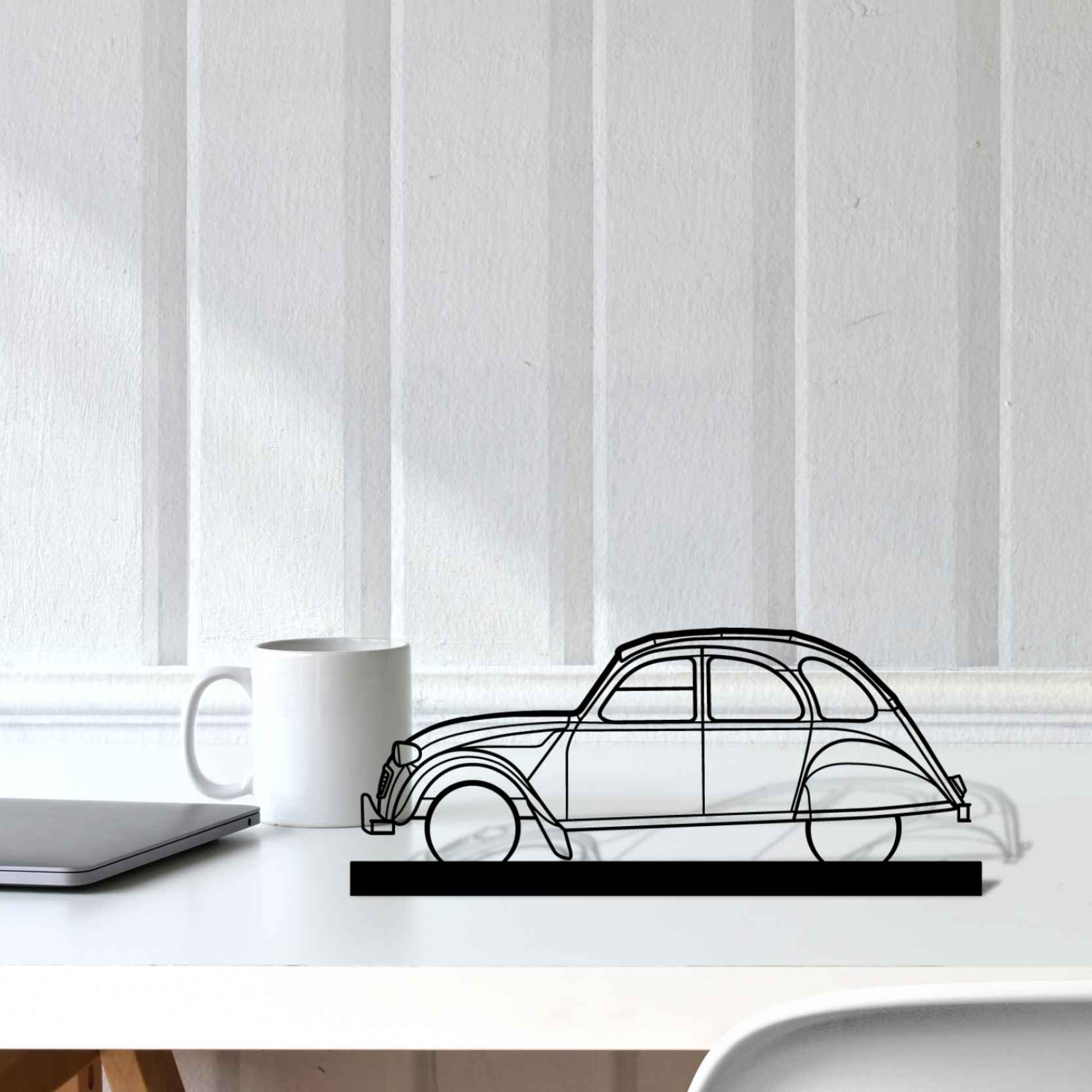 Diese 2CV Silhouette-Kunstständer aus Metall verleiht Ihrem Schreibtisch, Wohnzimmer oder Ihrer Garagenablage einen einzigartigen Look, der die Aufmerksamkeit aller Rennsport- und Autoliebhaber auf sich zieht und Ihrem Wohndesign eine subtile Note verleiht.