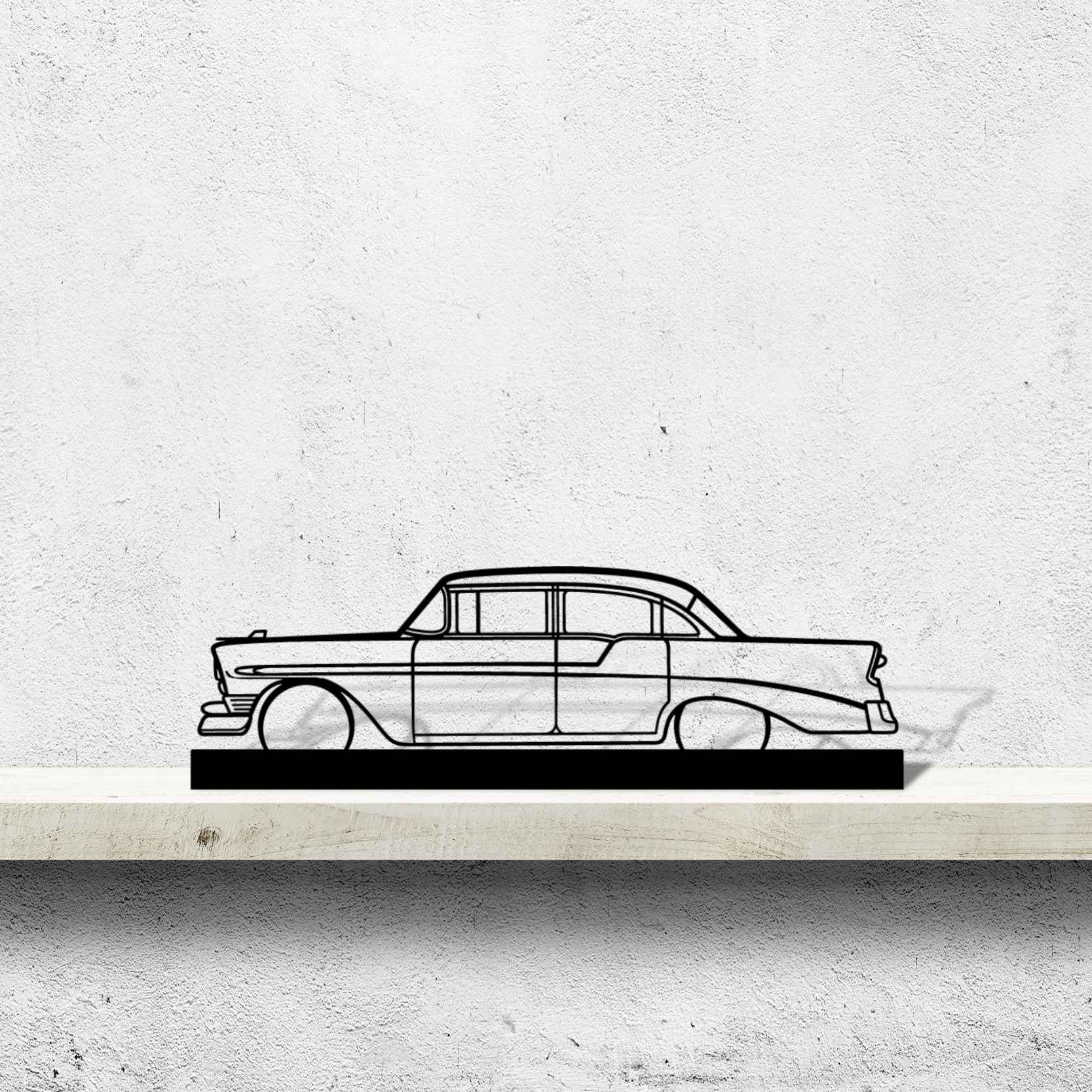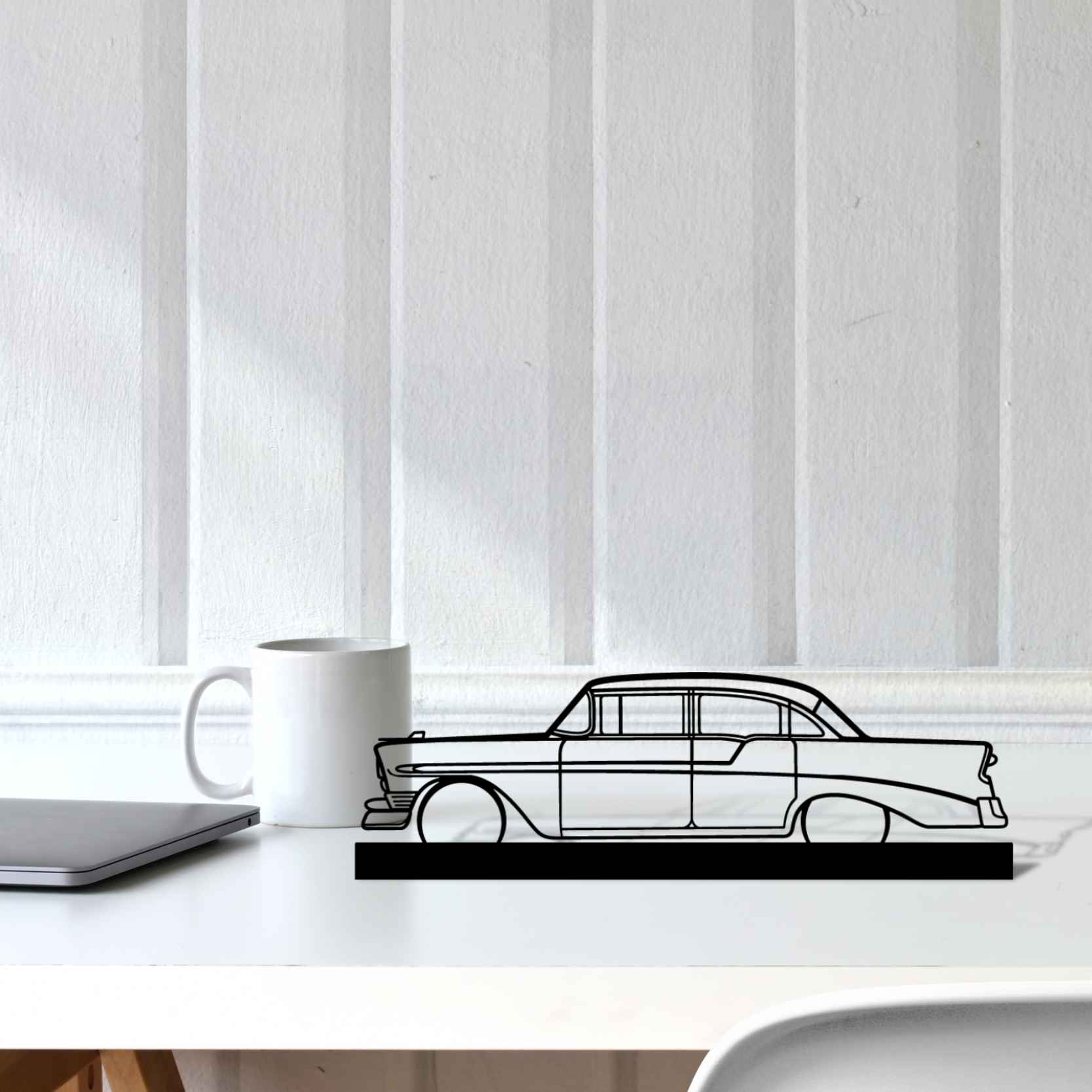 Diese Bel Air 1956 Silhouette-Kunstständer aus Metall verleiht Ihrem Schreibtisch, Wohnzimmer oder Ihrer Garagenablage einen einzigartigen Look, der die Aufmerksamkeit aller Rennsport- und Autoliebhaber auf sich zieht und Ihrem Wohndesign eine subtile Note verleiht.