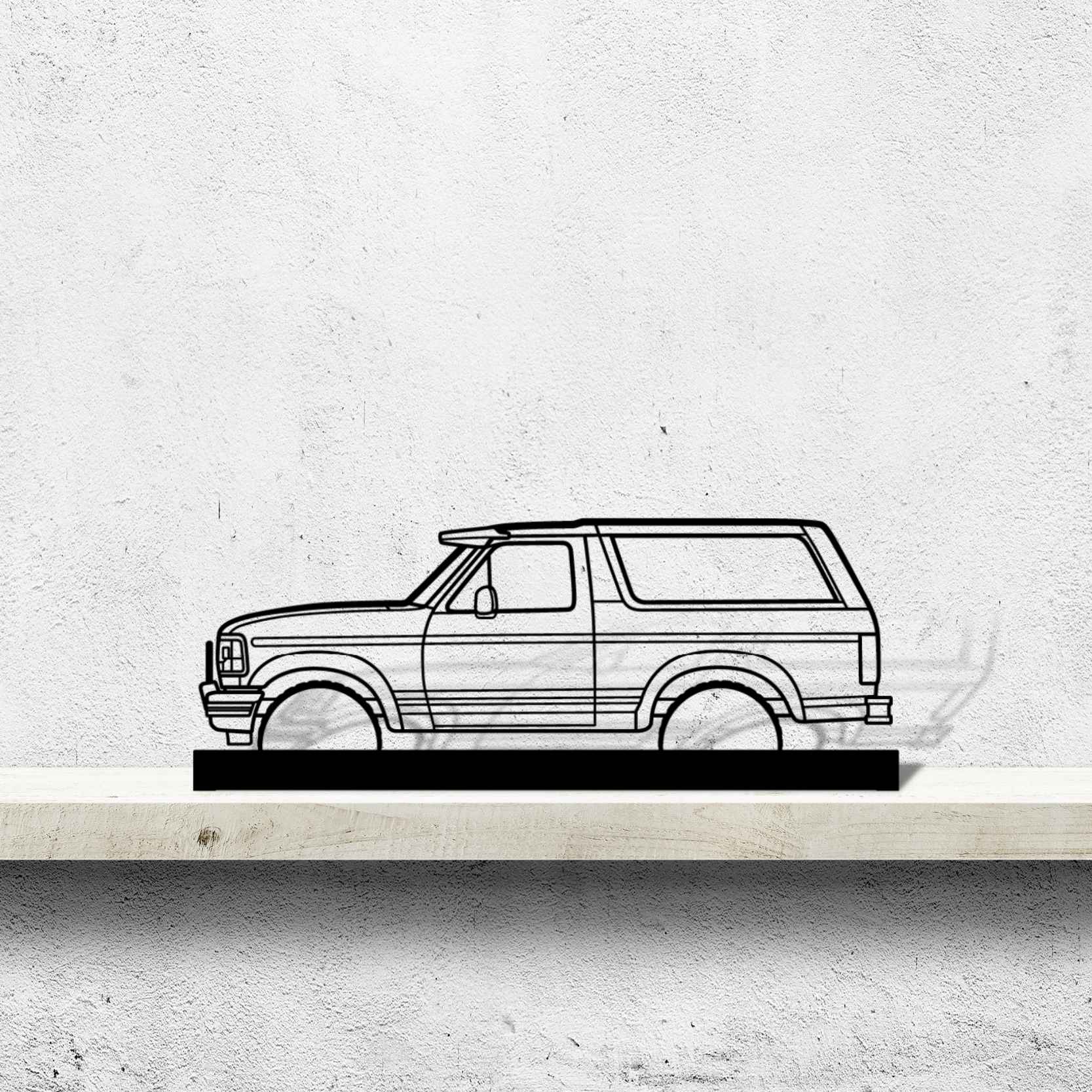 Diese Bronco XLT 1995 Silhouette-Kunstständer aus Metall verleiht Ihrem Schreibtisch, Wohnzimmer oder Ihrer Garagenablage einen einzigartigen Look, der die Aufmerksamkeit aller Rennsport- und Autoliebhaber auf sich zieht und Ihrem Wohndesign eine subtile Note verleiht.