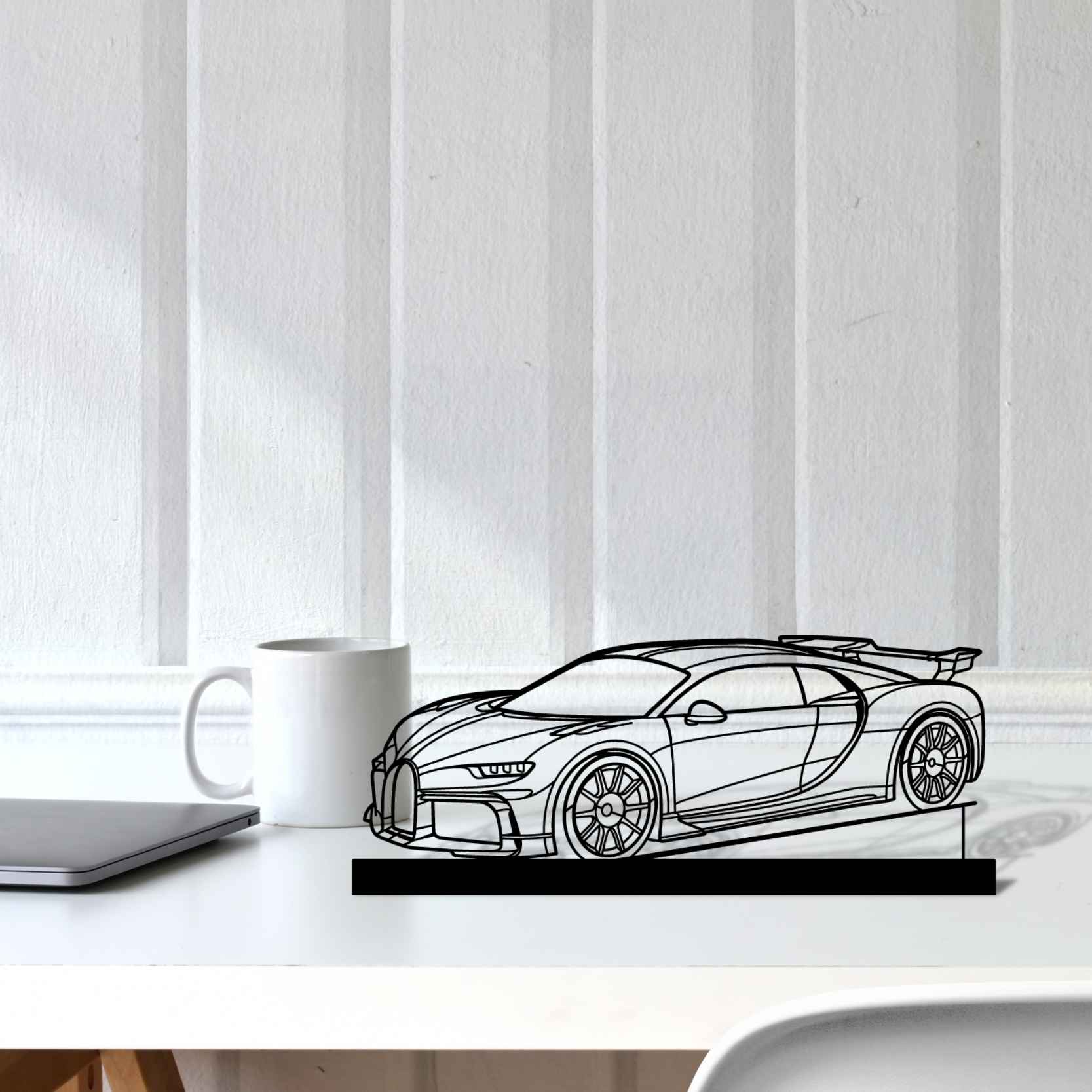 Diese Chiron Pur Sport 2021 Winkel-Silhouette-Kunstständer aus Metall verleiht Ihrem Schreibtisch, Wohnzimmer oder Ihrer Garagenablage einen einzigartigen Look, der die Aufmerksamkeit aller Rennsport- und Autoliebhaber auf sich zieht und Ihrem Wohndesign eine subtile Note verleiht.