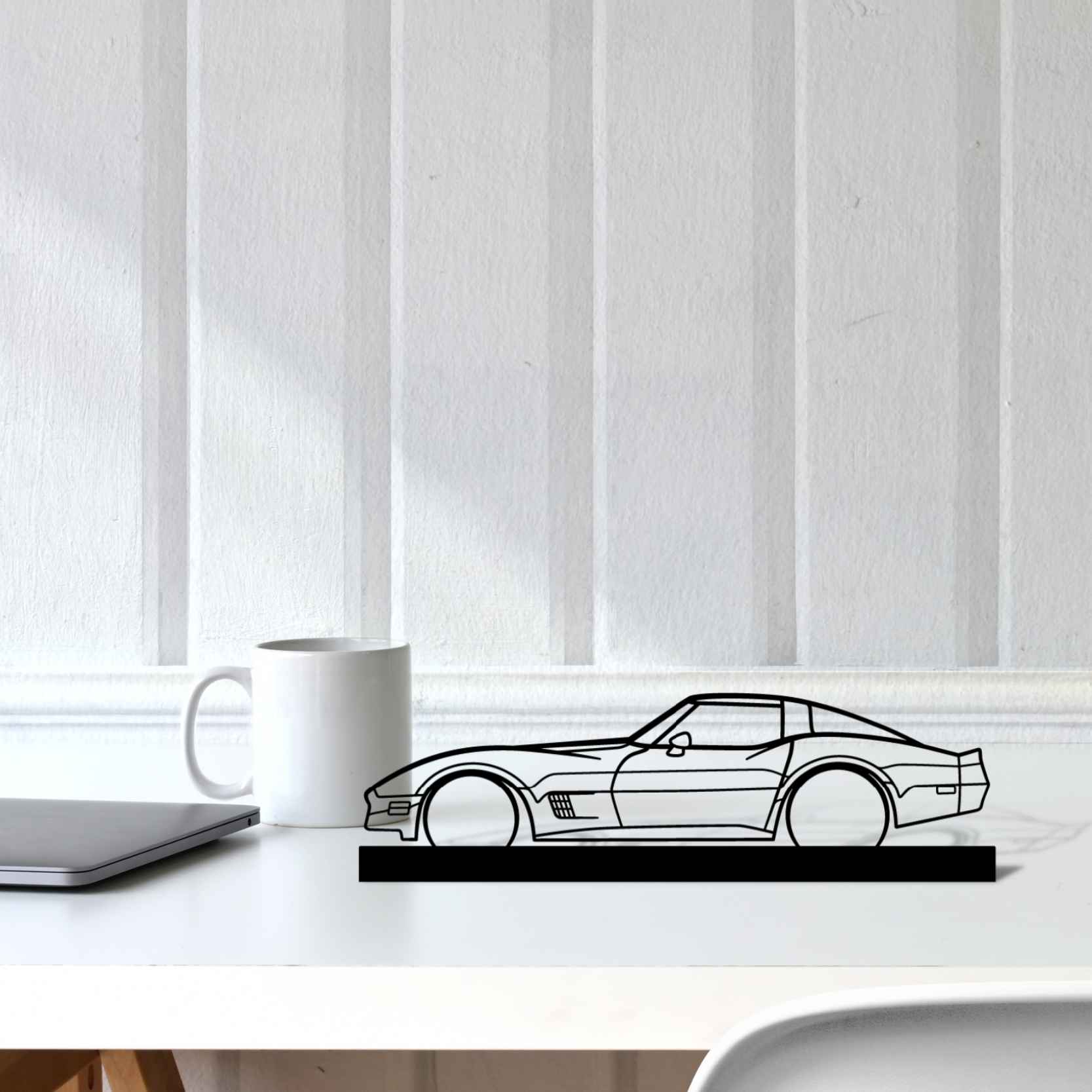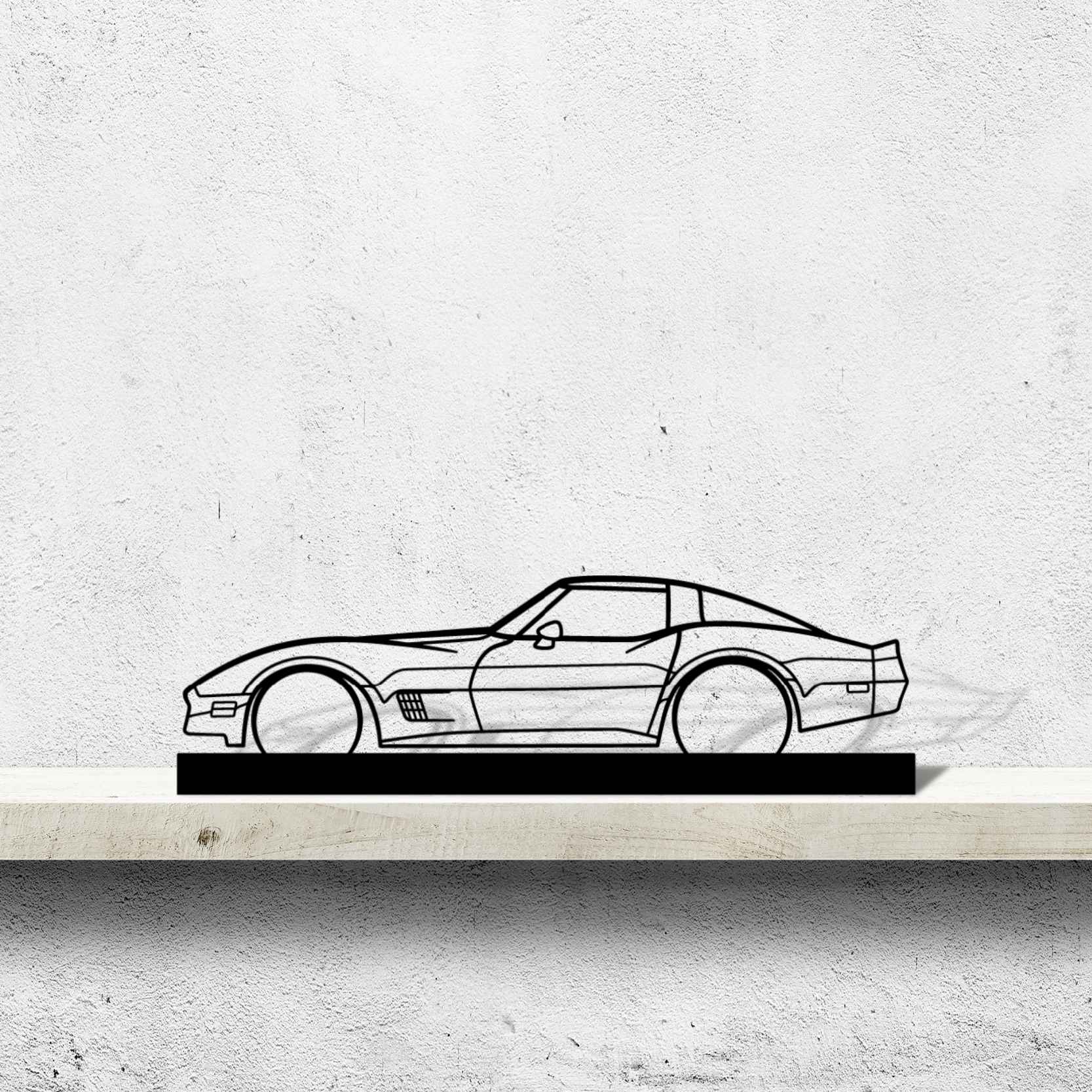Diese Corvette 1982 Silhouette-Kunstständer aus Metall verleiht Ihrem Schreibtisch, Wohnzimmer oder Ihrer Garagenablage einen einzigartigen Look, der die Aufmerksamkeit aller Rennsport- und Autoliebhaber auf sich zieht und Ihrem Wohndesign eine subtile Note verleiht.