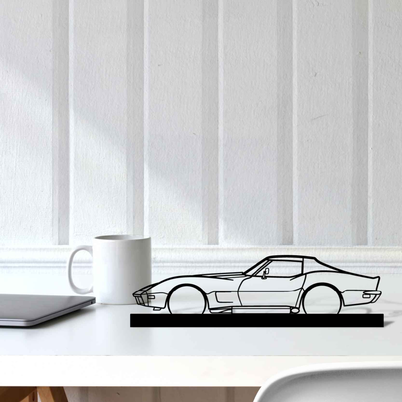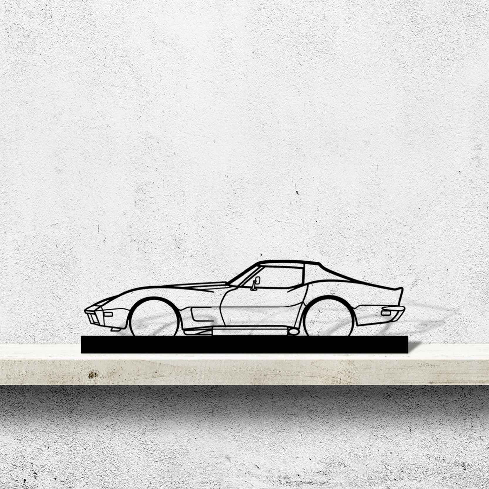 Diese Corvette C3 1973 Silhouette-Kunstständer aus Metall verleiht Ihrem Schreibtisch, Wohnzimmer oder Ihrer Garagenablage einen einzigartigen Look, der die Aufmerksamkeit aller Rennsport- und Autoliebhaber auf sich zieht und Ihrem Wohndesign eine subtile Note verleiht.
