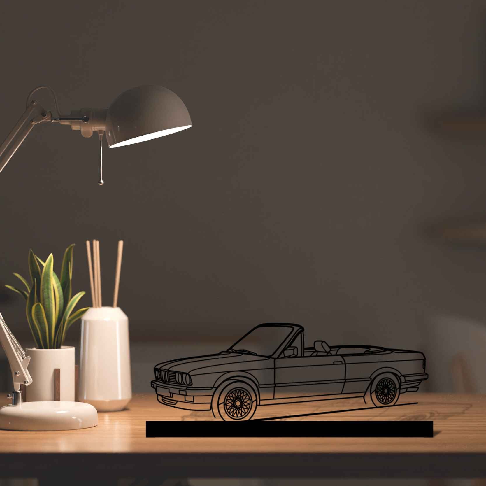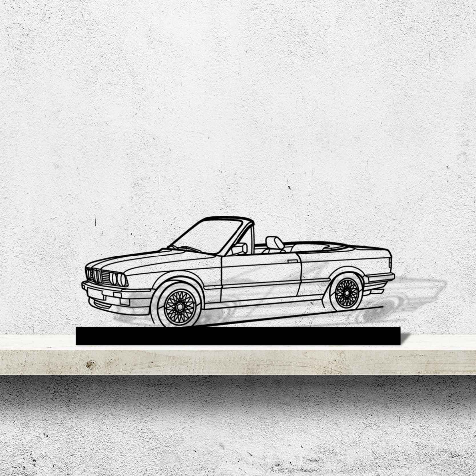 Diese E30 Convertible Winkel-Silhouette-Kunstständer aus Metall verleiht Ihrem Schreibtisch, Wohnzimmer oder Ihrer Garagenablage einen einzigartigen Look, der die Aufmerksamkeit aller Rennsport- und Autoliebhaber auf sich zieht und Ihrem Wohndesign eine subtile Note verleiht.