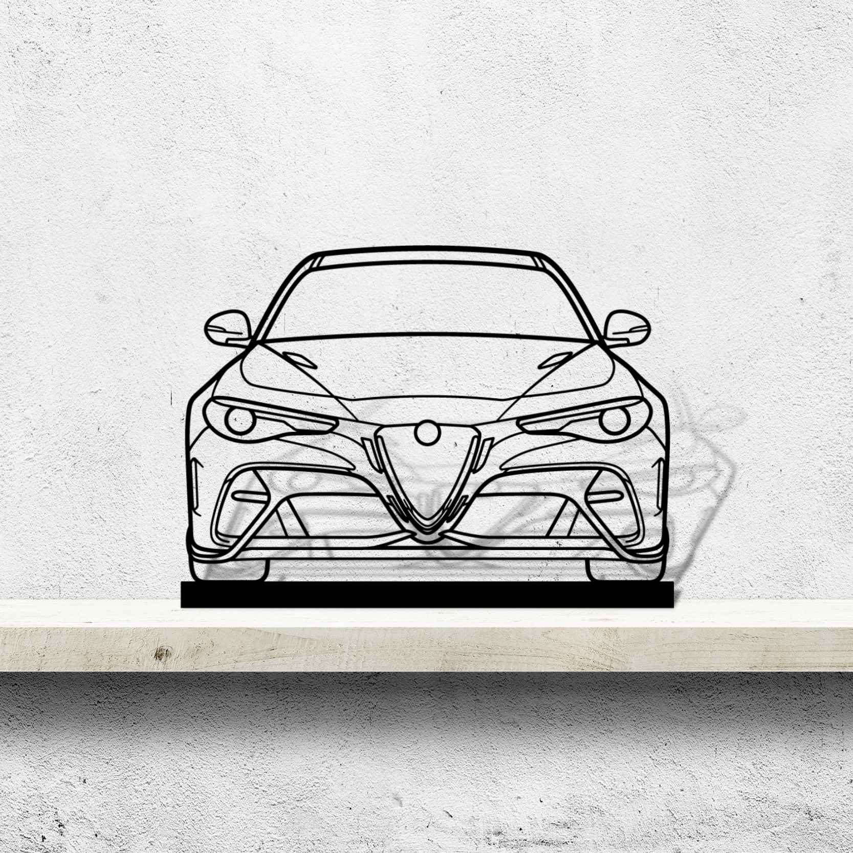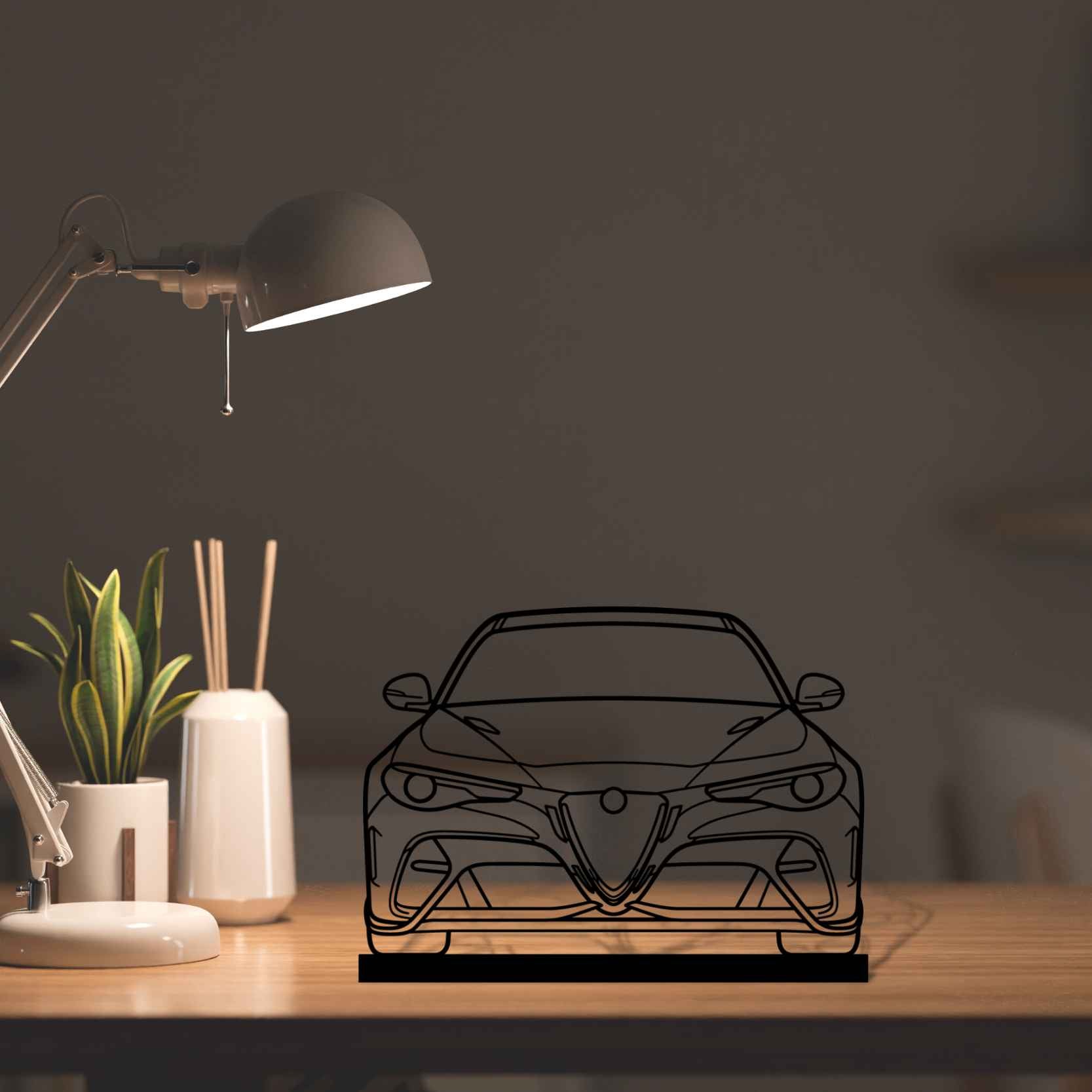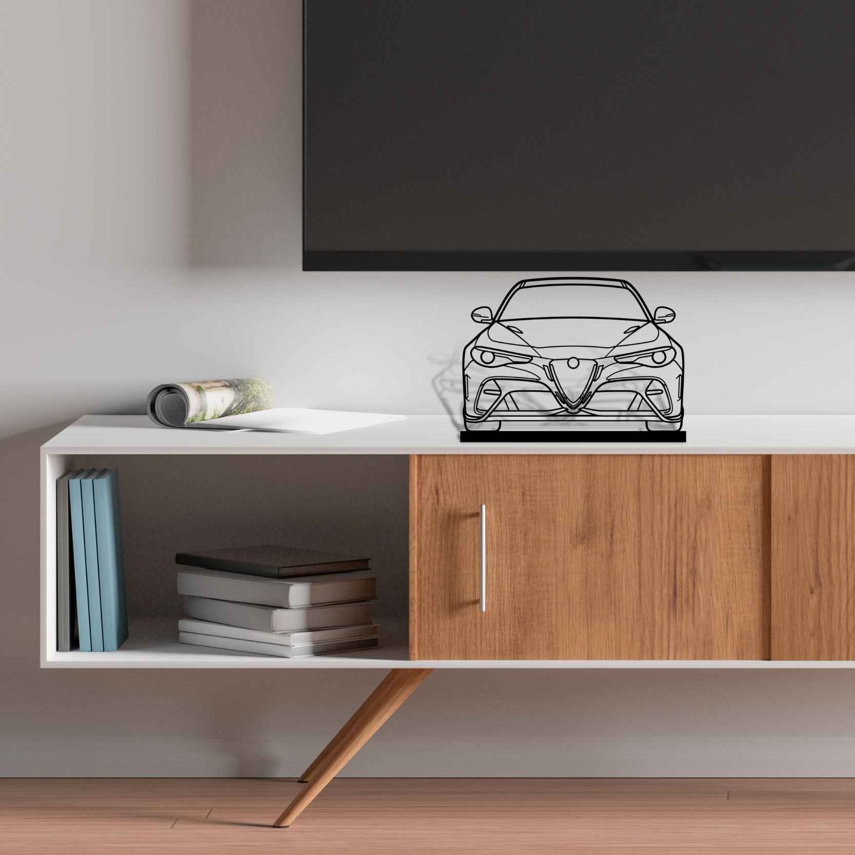 Diese Giulia GTAm Front 2020 Silhouette-Kunstständer aus Metall verleiht Ihrem Schreibtisch, Wohnzimmer oder Ihrer Garagenablage einen einzigartigen Look, der die Aufmerksamkeit aller Rennsport- und Autoliebhaber auf sich zieht und Ihrem Wohndesign eine subtile Note verleiht.