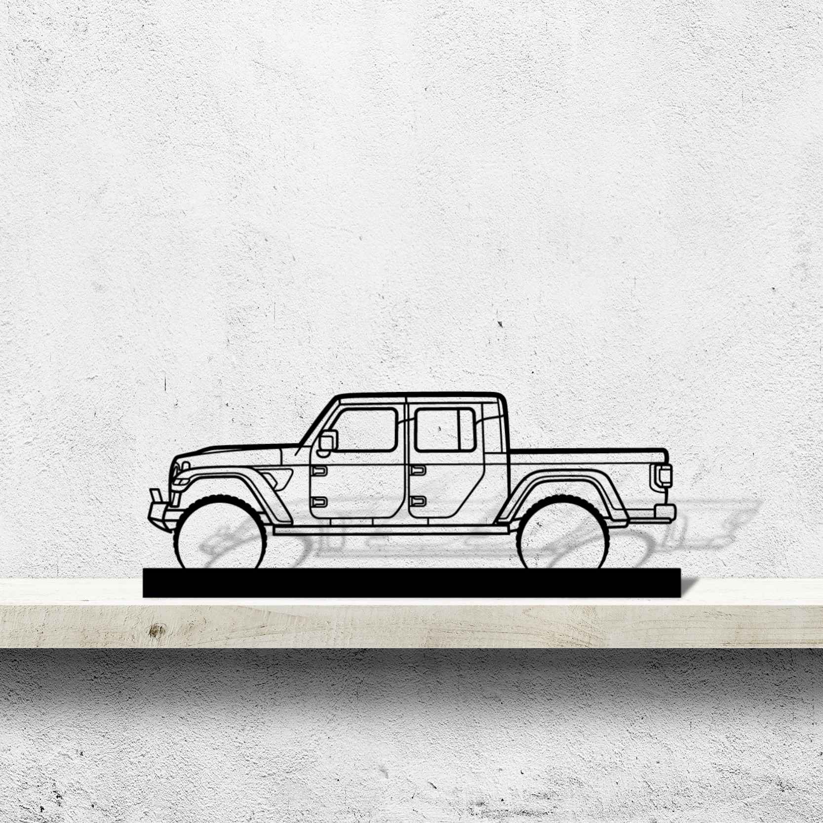 Alle unsere Standkunstwerke verfügen über eine nahezu nahtlose Stützplatte aus dem gleichen Metall, die die Silhouette auf einer ebenen Fläche stabil hält und für den 3D-Effekt sorgt.