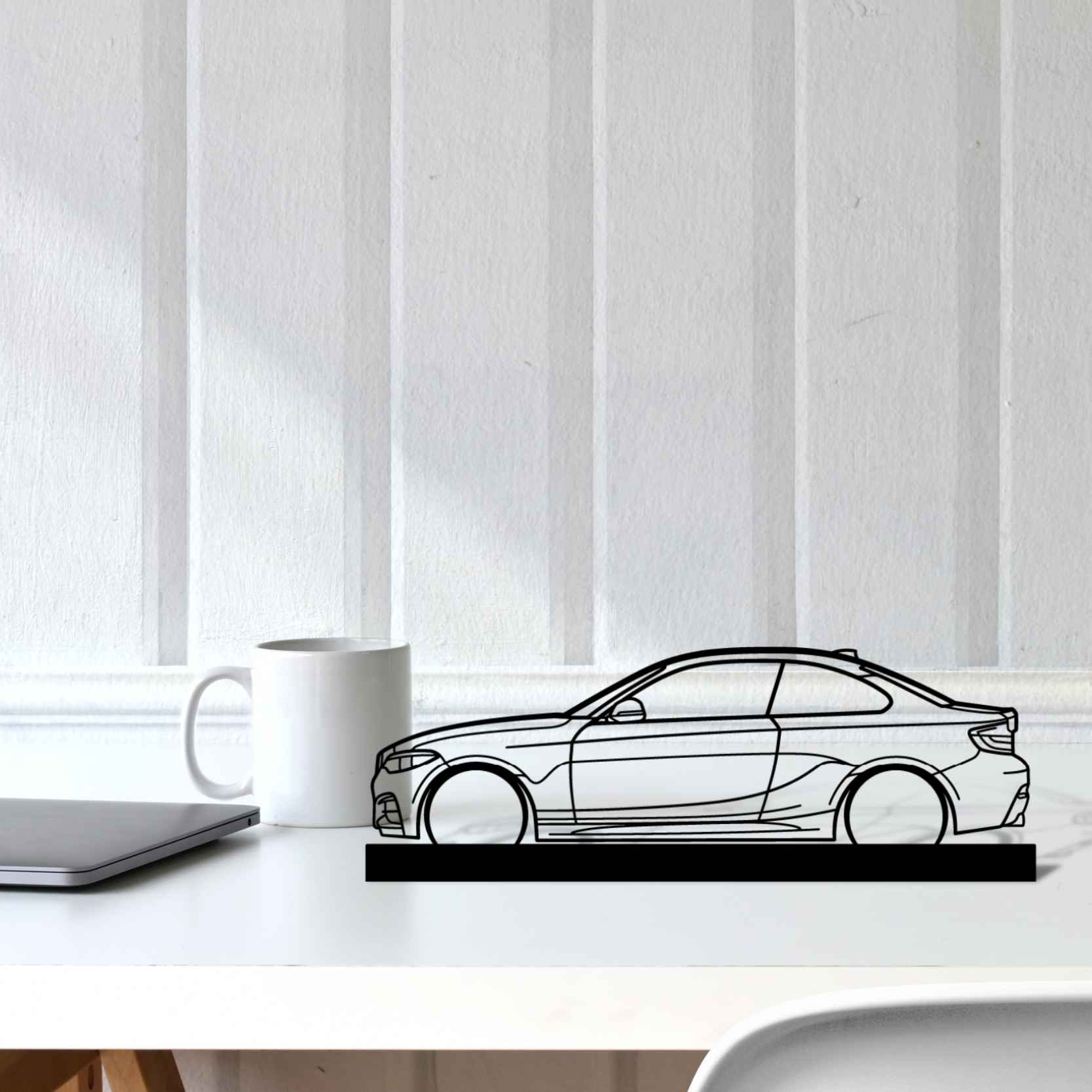 Diese M240i F22 Silhouette-Kunstständer aus Metall verleiht Ihrem Schreibtisch, Wohnzimmer oder Ihrer Garagenablage einen einzigartigen Look, der die Aufmerksamkeit aller Rennsport- und Autoliebhaber auf sich zieht und Ihrem Wohndesign eine subtile Note verleiht.