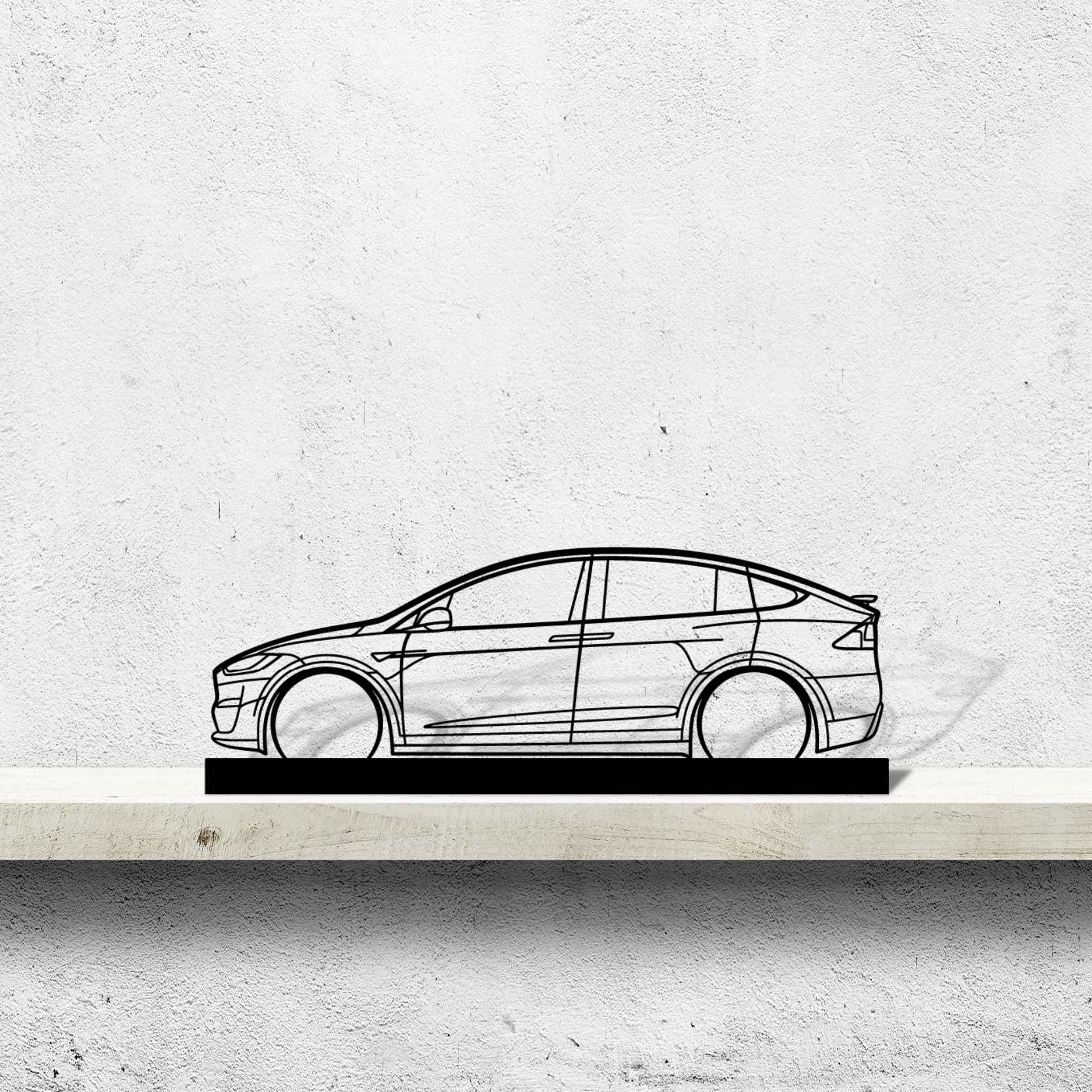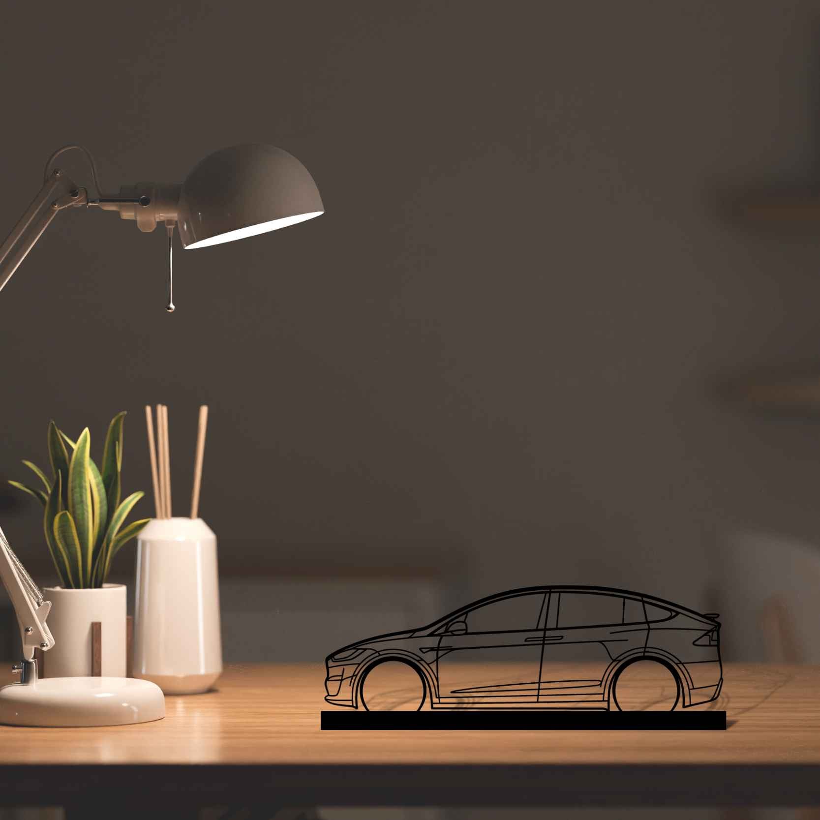 Diese Model X Silhouette-Kunstständer aus Metall verleiht Ihrem Schreibtisch, Wohnzimmer oder Ihrer Garagenablage einen einzigartigen Look, der die Aufmerksamkeit aller Rennsport- und Autoliebhaber auf sich zieht und Ihrem Wohndesign eine subtile Note verleiht.