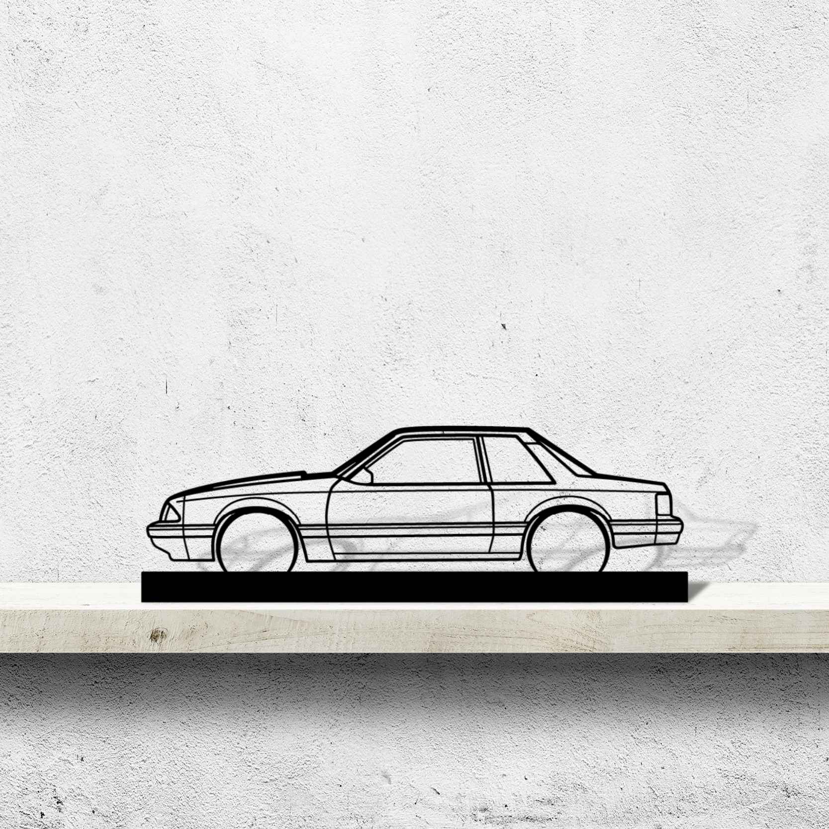 Diese Mustang 1993 Notch back Silhouette-Kunstständer aus Metall verleiht Ihrem Schreibtisch, Wohnzimmer oder Ihrer Garagenablage einen einzigartigen Look, der die Aufmerksamkeit aller Rennsport- und Autoliebhaber auf sich zieht und Ihrem Wohndesign eine subtile Note verleiht.