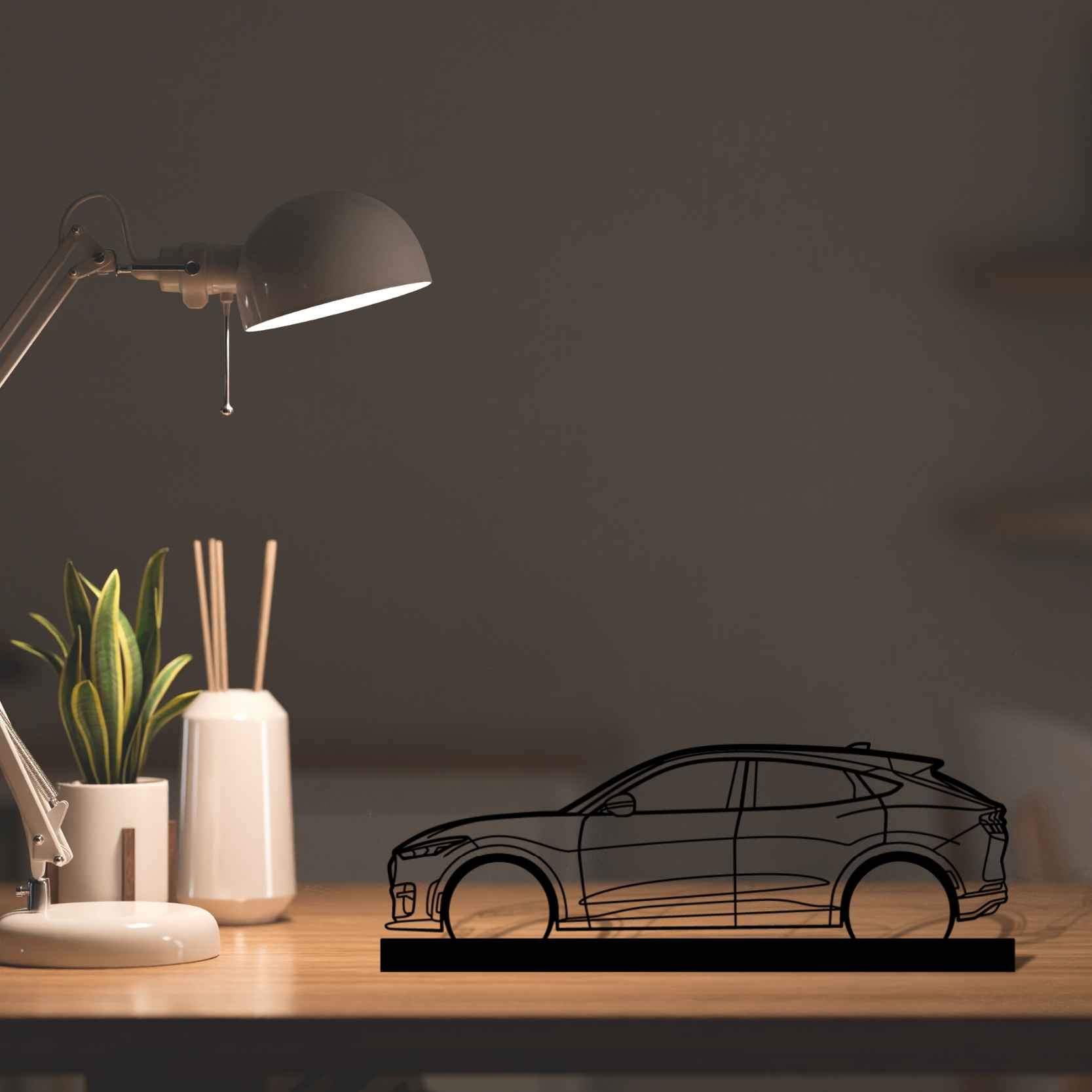 Diese Mustang Mach E GT Silhouette-Kunstständer aus Metall verleiht Ihrem Schreibtisch, Wohnzimmer oder Ihrer Garagenablage einen einzigartigen Look, der die Aufmerksamkeit aller Rennsport- und Autoliebhaber auf sich zieht und Ihrem Wohndesign eine subtile Note verleiht.
