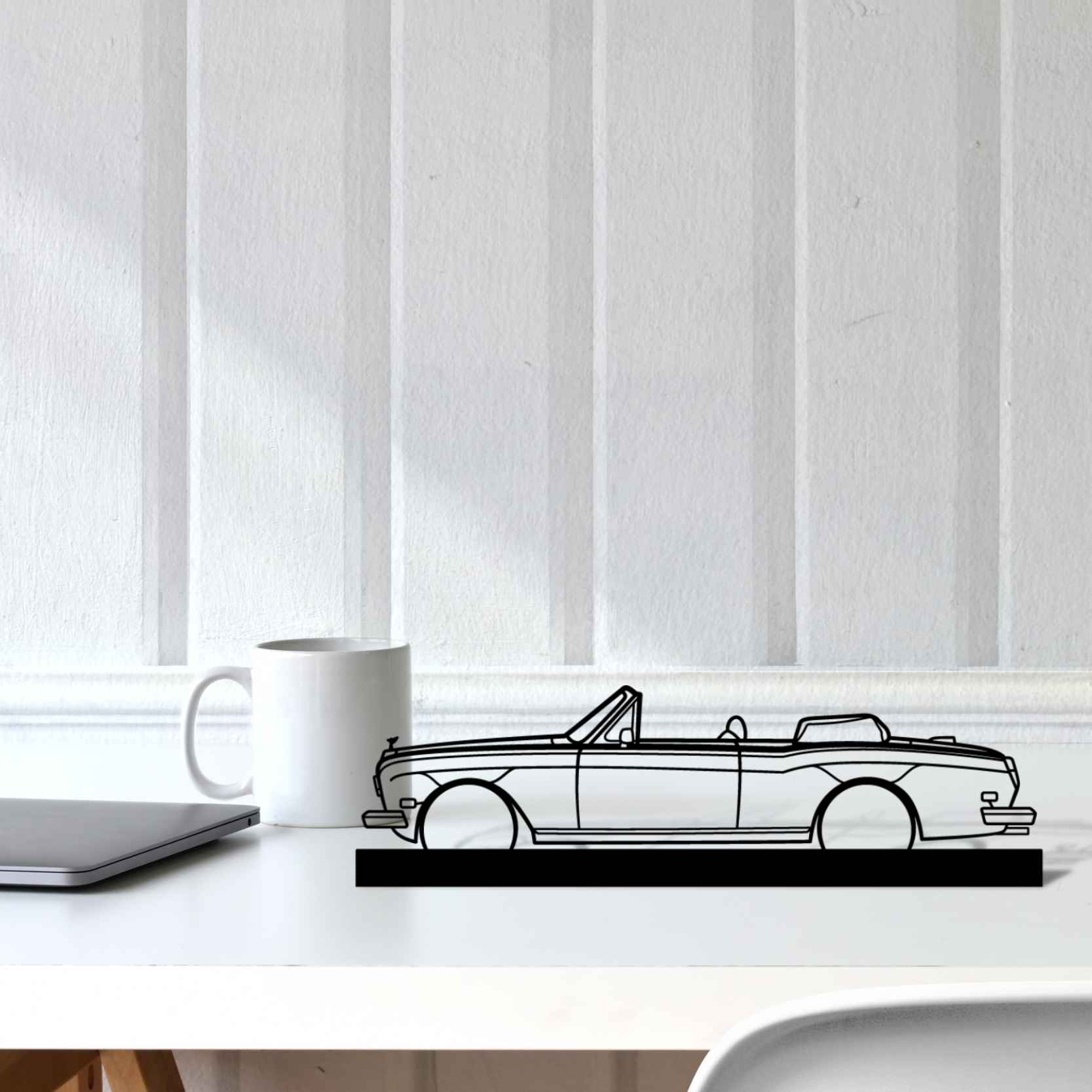 Diese Royce Corniche convertible 1981 Silhouette-Kunstständer aus Metall verleiht Ihrem Schreibtisch, Wohnzimmer oder Ihrer Garagenablage einen einzigartigen Look, der die Aufmerksamkeit aller Rennsport- und Autoliebhaber auf sich zieht und Ihrem Wohndesign eine subtile Note verleiht.