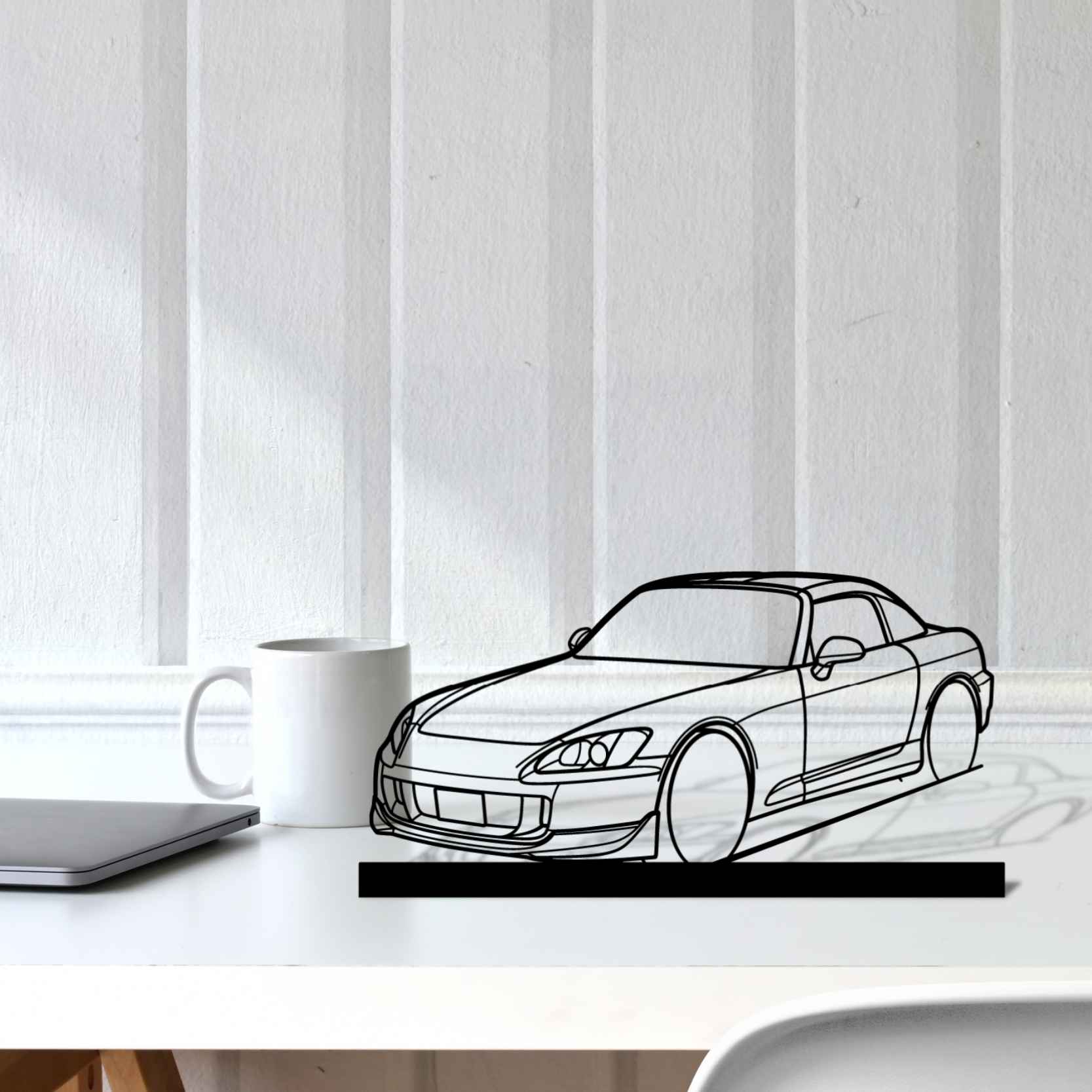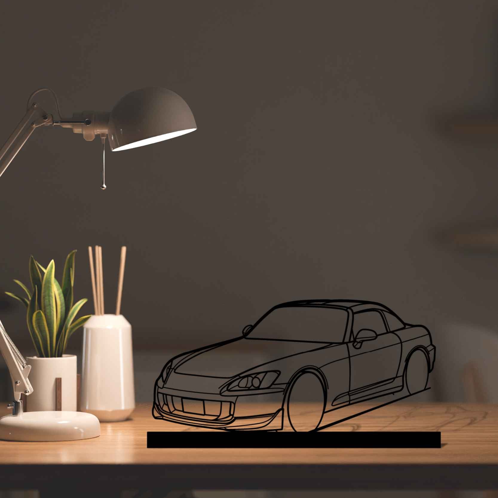 Diese S2000 Hard Top Winkel-Silhouette-Kunstständer aus Metall verleiht Ihrem Schreibtisch, Wohnzimmer oder Ihrer Garagenablage einen einzigartigen Look, der die Aufmerksamkeit aller Rennsport- und Autoliebhaber auf sich zieht und Ihrem Wohndesign eine subtile Note verleiht.